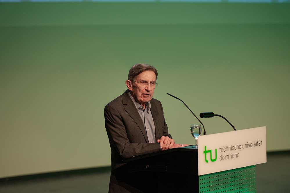 Nach der Begrüßung der Gäste bat Rektor Prof. Manfred Bayer zunächst um ein stilles Gedenken an den kürzlich verstorbenen Altrektor Prof. Paul Velsinger, der in seiner Amtszeit von 1978 bis 1990 vor allem die Integration der Pädagogischen Hochschule Ruhr geleitet sowie den Aufbau des benachbarten Technologiezentrums mitinitiiert hatte. In seiner Ansprache nahm Bayer zudem Bezug auf das Kriegsgeschehen in der Welt, insbesondere den Konflikt im Nahen Osten, der aktuell auf Hochschulen weltweit ausstrahle. Er machte deutlich: „Die TU Dortmund ist ein Ort des respektvollen Miteinanders. Anfeindungen haben hier keinen Platz. Wir dulden insbesondere keine Form von Antisemitismus“, sagte er unter dem Applaus der zahlreichen Gäste. Die Universität habe den Angriff der Hamas auf Israel Anfang Oktober scharf verurteilt und zugleich deutlich gemacht, dass sie das Leid aller Opfer der daraus folgenden Gewalteskalation anerkenne. „Wir sind dankbar dafür, dass auf unserem Campus Menschen aus über 130 Nationen friedlich miteinander lernen und forschen. Diskriminierung aufgrund von Herkunft, Religion, Geschlecht oder sexueller Orientierung treten wir entschieden entgegen.“