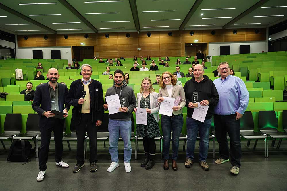 Bildzeile: Dr. Michael Brenscheidt (2.v.l.), Stifter des Transferpreises, und Prof. Gerhard Schembecker (r.), Prorektor Finanzen, überreichten die Auszeichnungen an (v.r.) Uwe Grützner, Prof. Anna-Lena Scherger, Jannika Böse und Alaa Guenak (in Vertretung für Dr. Alvaro Ortiz Pérez). Sina Sadegh Nadi (l.) vom CET hat die Veranstaltung moderiert.