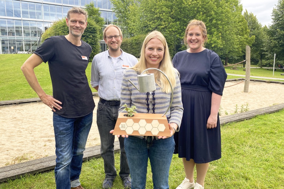 Auf dem Bild zusehen: Prof. Dr. Sabrina Scheidler (vorne) vom Fachbereich Wirtschaft der FH Dortmund bekommt den ersten Impact-Cup. Es gratulieren (v.r.): Svenja Stepper, Kanzlerin der FH Dortmund, Prof. Dr. Franz Vogler, Prorektor für Nachhaltigkeit und Digitalisierung, und Nachhaltigkeitsmanager Sebastian Kreimer. Foto: FH Dortmund / Benedikt Reichel