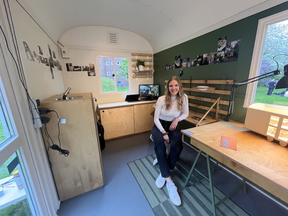 Arbeitsplätze, Lounge-Ecke, Kino, Garderobe, Ausstellungsfläche und Teeküche – alles auf zehn Quadratmetern. Das neue mobile Nachhaltigkeitsbüro der Fachhochschule Dortmund ist ein Raumwunder. Der Bauwagen namens „Soffi“, eine Abkürzung für Sustainability Office, ist die Bachelor-Arbeit von Design-Studentin Marie Gowert. Das Büro mit Anhängerkupplung wird ab jetzt an wechselnden Standorten auf dem Campus und in der Stadt stehen.