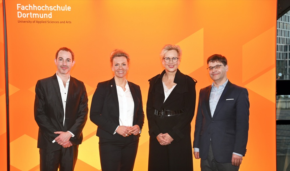 Auf dem Bild zusehen von links: Tobias Ehinger (Geschäftsführender Direktor am Theater Dortmund), Ina Brandes (Ministerin für Kultur und Wissenschaft des Landes Nordrhein-Westfalen), Prof. Dr. Tamara Appel (Rektorin der Fachhochschule Dortmund) und Heribert Germeshausen (Intendant der Oper Dortmund). Foto: FH Dortmund / Tilman Abegg