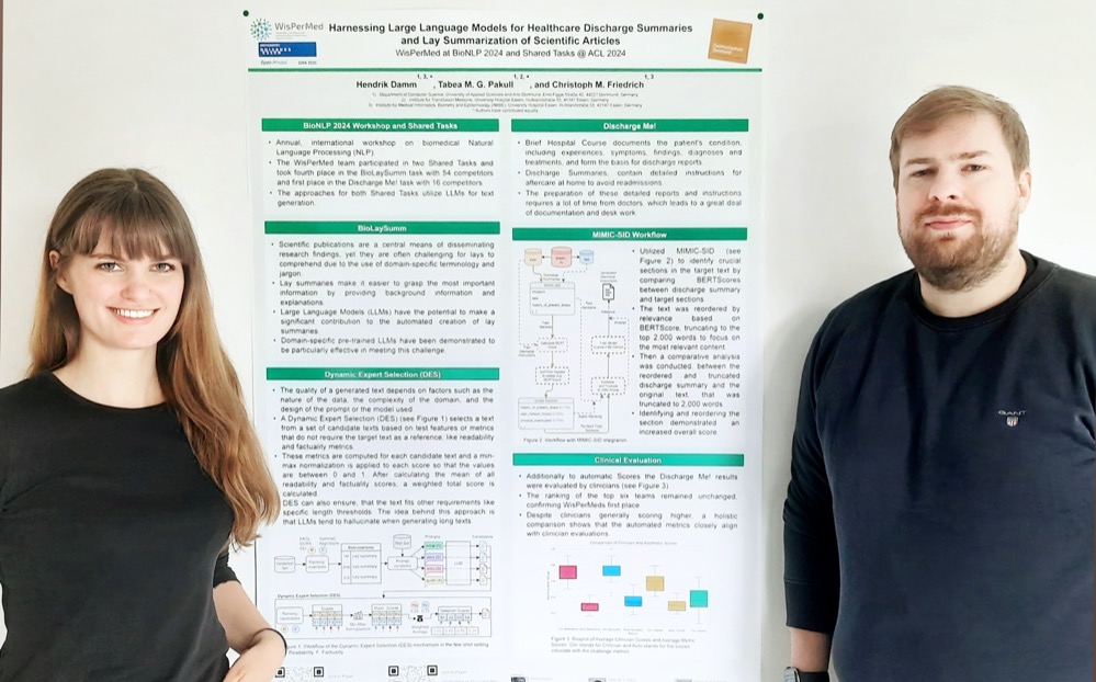 Hervorragende Kenntnisse und Fähigkeiten in der Entwicklung von KI-Programmen bewiesen die FH-Dortmund-Promovend*innen Tabea Pakull und Hendrik Damm beim diesjährigen internationalen BioNLP-Wettbewerb. Gleich zweimal belegten sie als Team des Graduiertenkollegs WisPerMed einen sehr guten Platz.