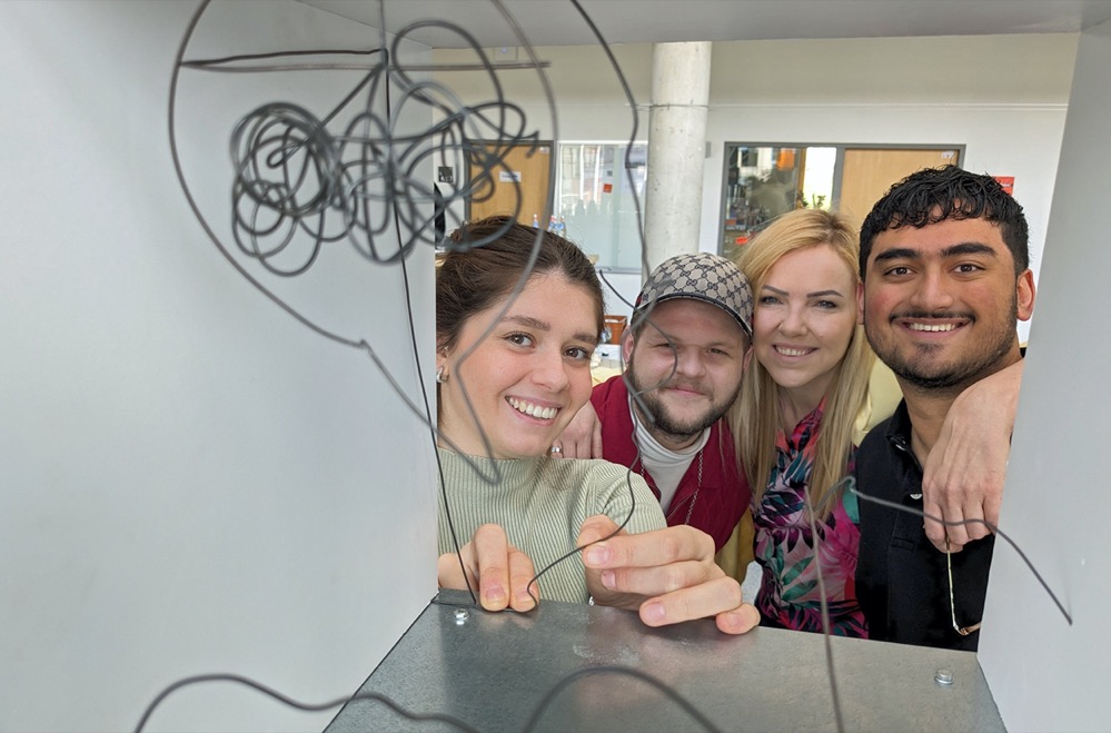 Zwölf Dortmunder Student*innen und ebenso viele Gäste des Fachbereichs Industriedesign der MSU Denver arbeiteten bei der Spring School 2024 eine Woche lang zusammen an kleinen und großen Drahtkonstruktionen. Die Gebilde vergrößerten ihre Wirkung noch im Zusammenspiel mit Licht, wenn Schatten eine zusätzliche Ebene zur realen Konstruktion schufen.