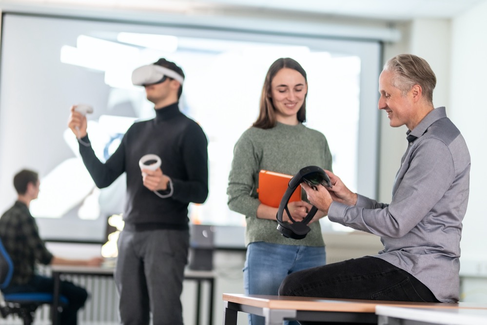 Auf dem Bild zusehen: Prof. Dr. Frank Gustrau (r.), Dekan des Fachbereichs Informationstechnik, im Gespräch mit Studierenden, die an Virtual-Reality-Projekten arbeiten. Foto: FH Dortmund / Mike Henning
