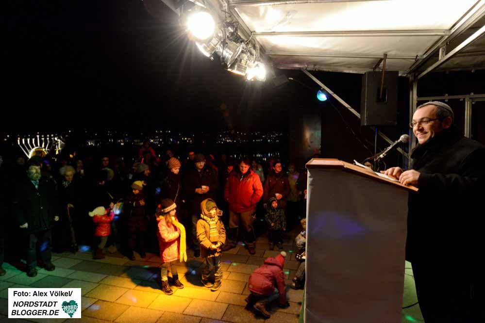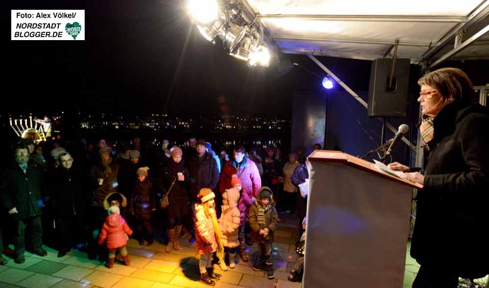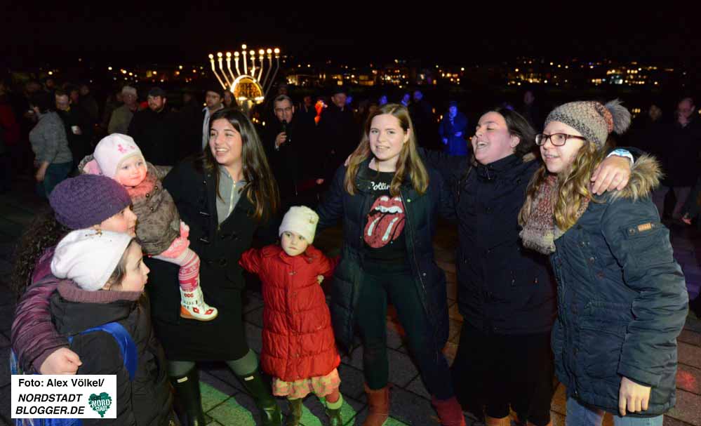 Gemeinsam erlebten sie, wie die Ehrengäste die Lichter am überdimensionalen Chanukka-Leuchter entzündeten. Sie standen stellvertretend für die anderen Religionsgemeinschaften, aber auch die Stadtgesellschaft. So waren auch Bürgermeisterin Birgit Jörder und Polizeipräsident Gregor Lange unter den Gästen.