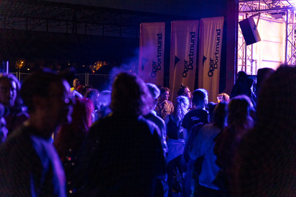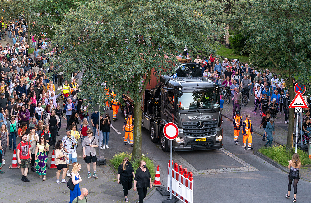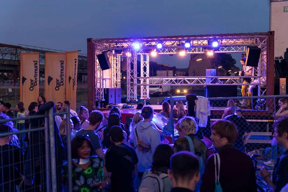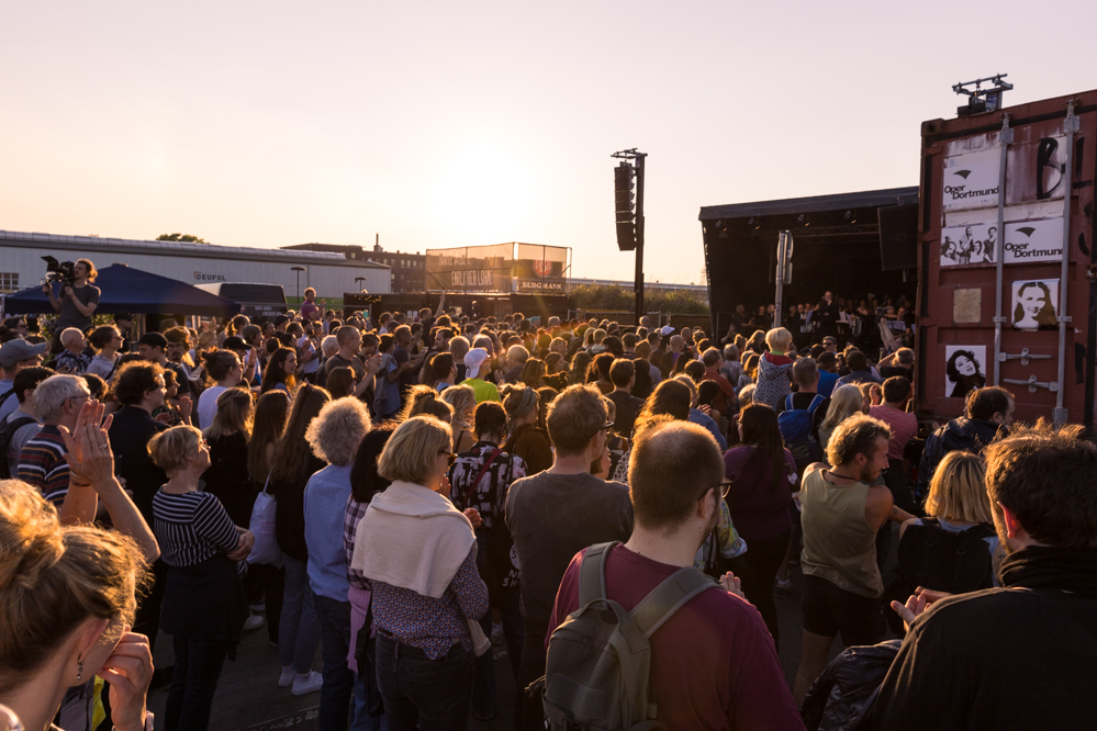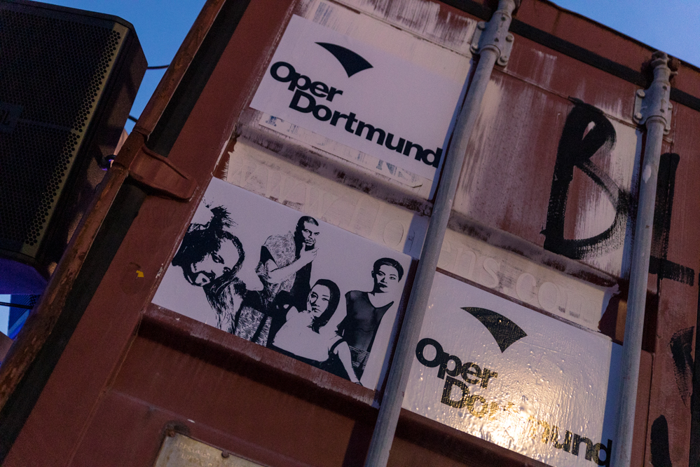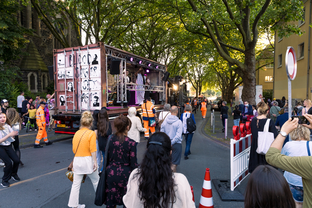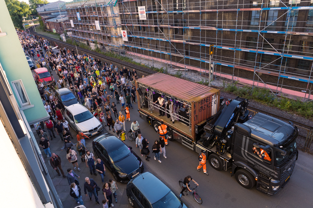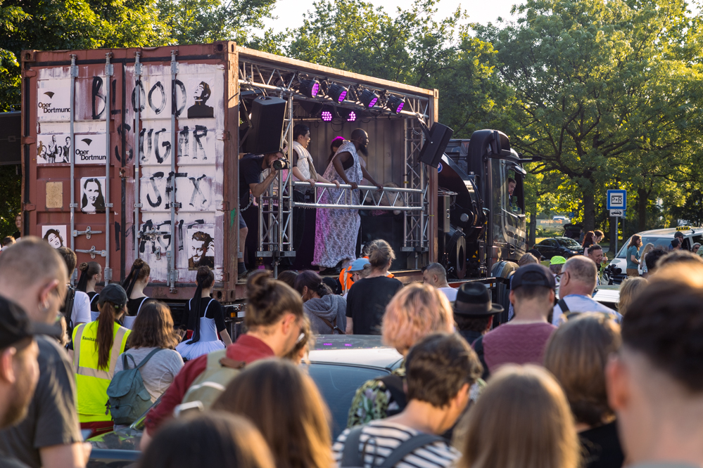 Seit Monaten haben zahlreiche Musiker:innen und Tänzer:innen auf diesen Tag hingearbeitet. Am Samstagabend verwandelten sie das Hafenviertel zu einem großen Opernsaal. Zunächst gab es eine Soundinstallation in den Blücherpark. Wenig später formierten sich Künstler:innen und Publikum zu einem großen Zug auf der Straße. Vorne weg ein LKW mit einem Hafencontainer auf der Ladefläche. Aus dem Container performten die Sänger:innen des Dortmunder Opernensembles Daegyun Jeong, Wendy Krikken und Mandla Mndebele zusammen mit den DJs 909 Schneider und WIFI GOLD.