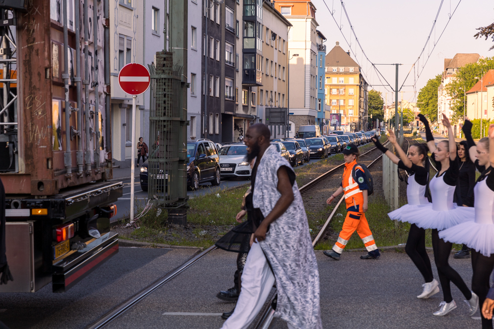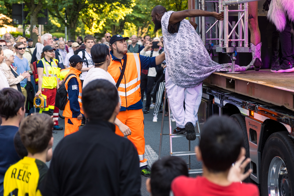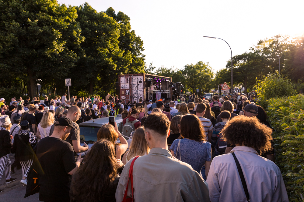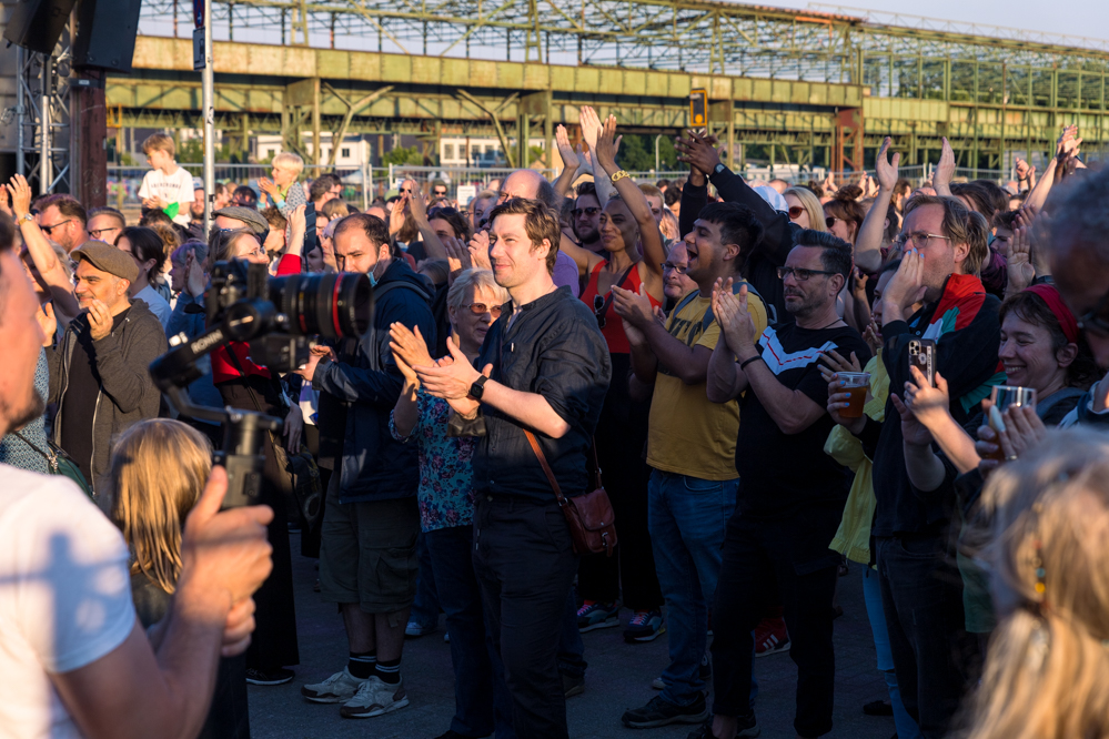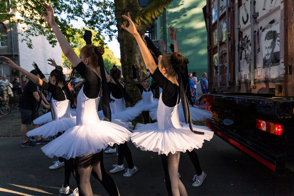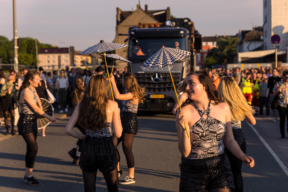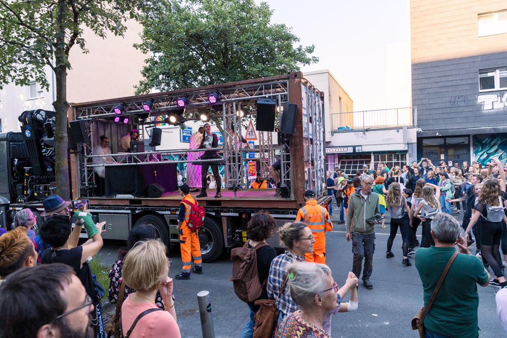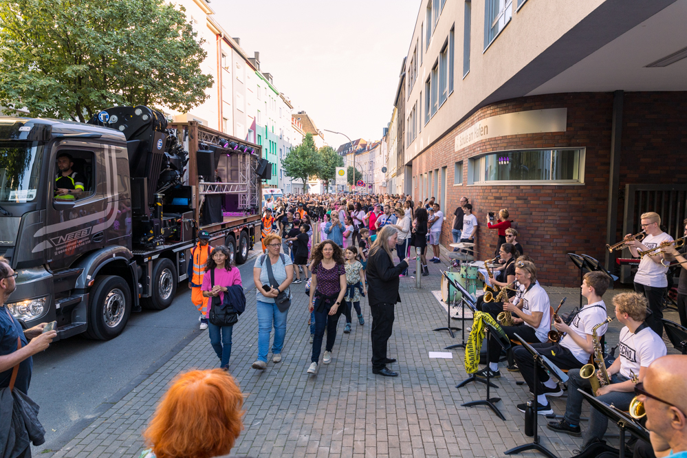 Seit Monaten haben zahlreiche Musiker:innen und Tänzer:innen auf diesen Tag hingearbeitet. Am Samstagabend verwandelten sie das Hafenviertel zu einem großen Opernsaal. Zunächst gab es eine Soundinstallation in den Blücherpark. Wenig später formierten sich Künstler:innen und Publikum zu einem großen Zug auf der Straße. Vorne weg ein LKW mit einem Hafencontainer auf der Ladefläche. Aus dem Container performten die Sänger:innen des Dortmunder Opernensembles Daegyun Jeong, Wendy Krikken und Mandla Mndebele zusammen mit den DJs 909 Schneider und WIFI GOLD.
