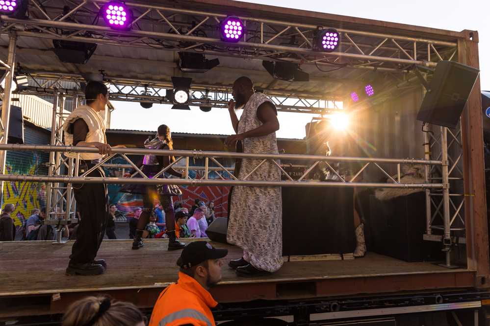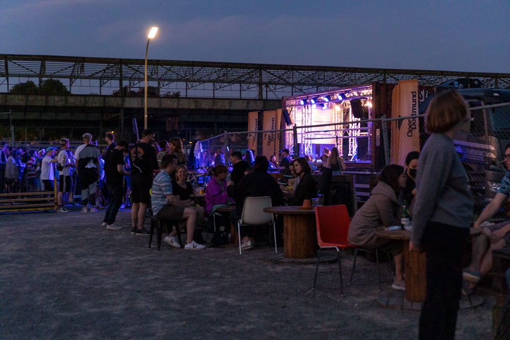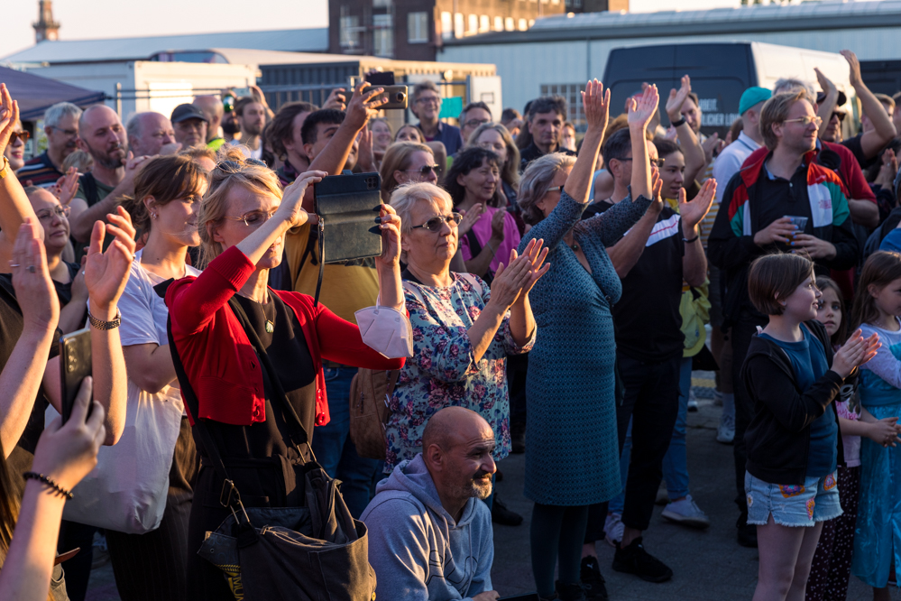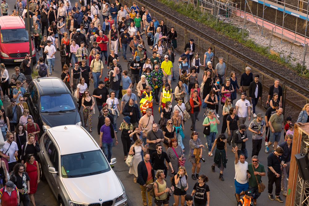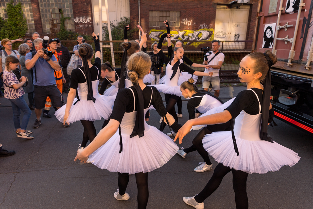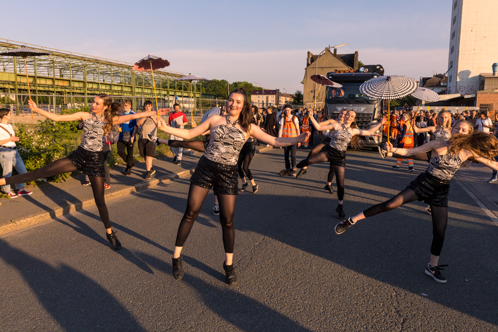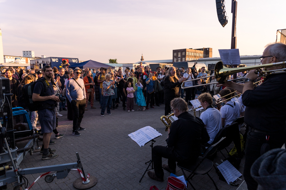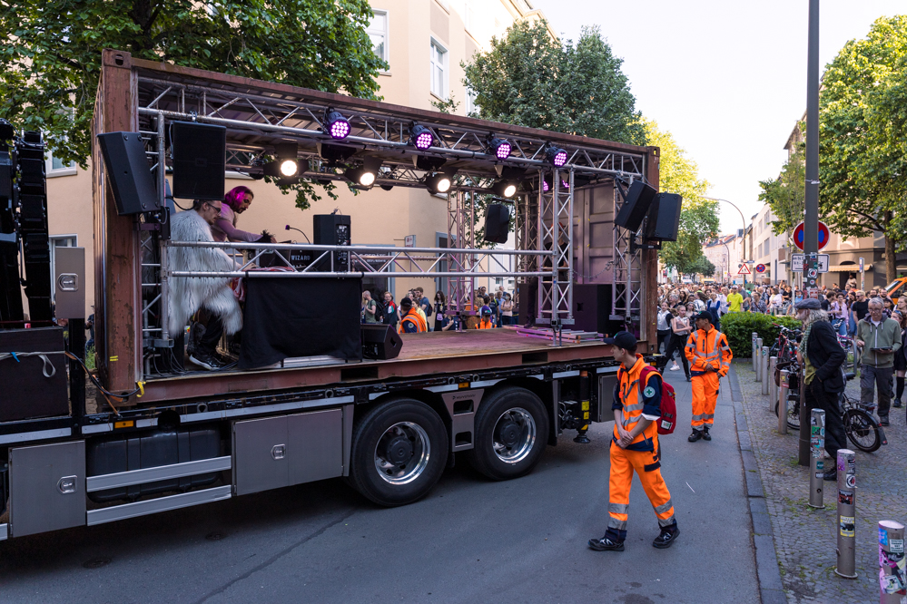 Seit Monaten haben zahlreiche Musiker:innen und Tänzer:innen auf diesen Tag hingearbeitet. Am Samstagabend verwandelten sie das Hafenviertel zu einem großen Opernsaal. Zunächst gab es eine Soundinstallation in den Blücherpark. Wenig später formierten sich Künstler:innen und Publikum zu einem großen Zug auf der Straße. Vorne weg ein LKW mit einem Hafencontainer auf der Ladefläche. Aus dem Container performten die Sänger:innen des Dortmunder Opernensembles Daegyun Jeong, Wendy Krikken und Mandla Mndebele zusammen mit den DJs 909 Schneider und WIFI GOLD.