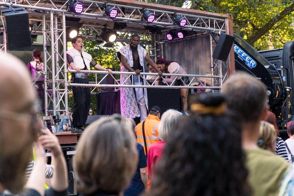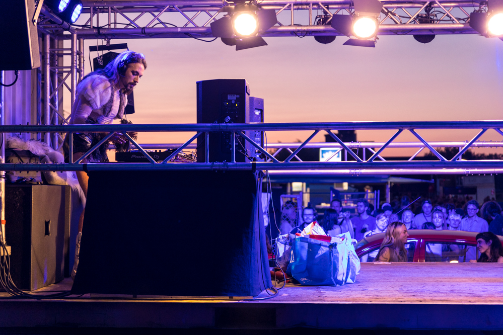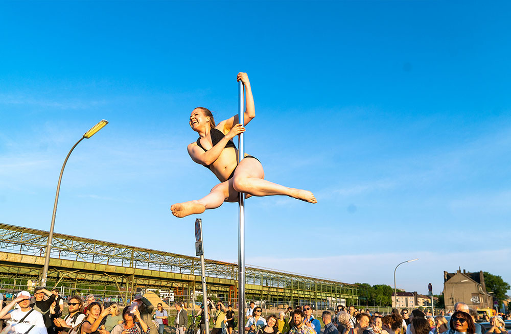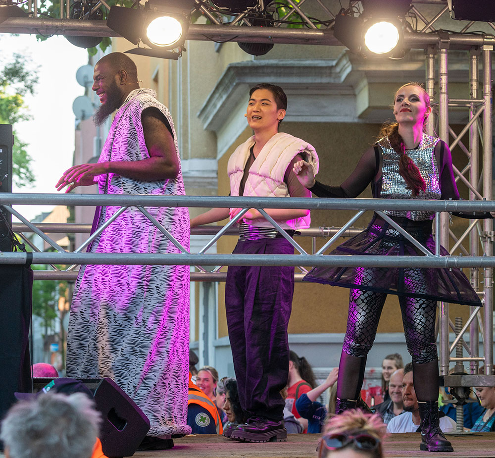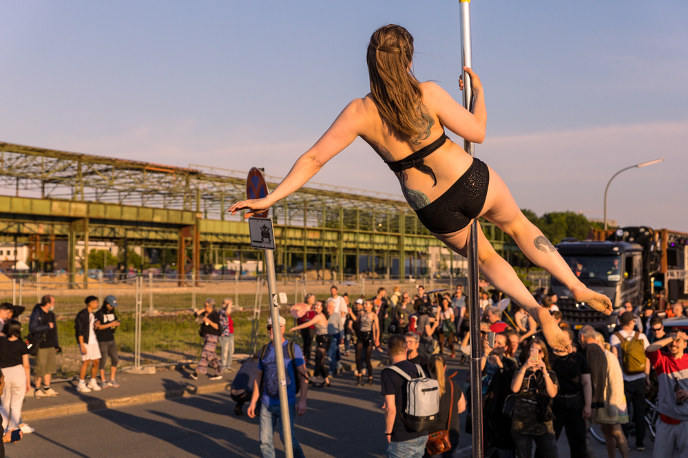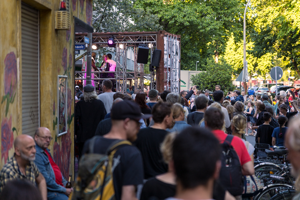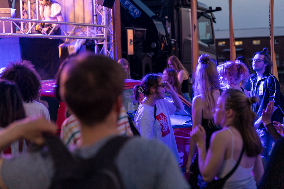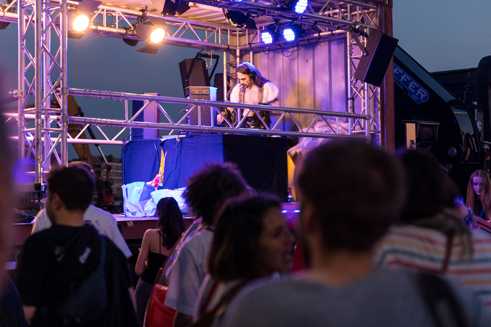 Seit Monaten haben zahlreiche Musiker:innen und Tänzer:innen auf diesen Tag hingearbeitet. Am Samstagabend verwandelten sie das Hafenviertel zu einem großen Opernsaal. Zunächst gab es eine Soundinstallation in den Blücherpark. Wenig später formierten sich Künstler:innen und Publikum zu einem großen Zug auf der Straße. Vorne weg ein LKW mit einem Hafencontainer auf der Ladefläche. Aus dem Container performten die Sänger:innen des Dortmunder Opernensembles Daegyun Jeong, Wendy Krikken und Mandla Mndebele zusammen mit den DJs 909 Schneider und WIFI GOLD.