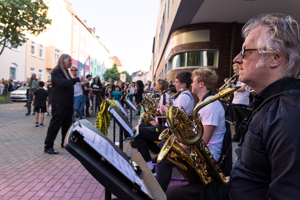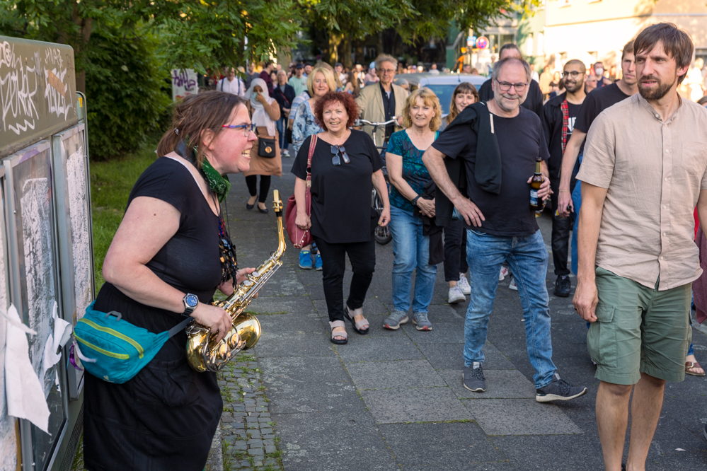 Auch zufällig Vorbeikommende sollten von der Oper mitgenommen werden. Und das gelang auch sehr gut. Zahlreiche Menschen schlossen sich dem Opernzug auf der Strecke an. Viele wurden durch die Klänge an ihre Fenster gelockt und schlossen sich anschließend teilweise der Menge an. Auch viele Nordstadt-Kinder verfolgten die Oper begeistert.