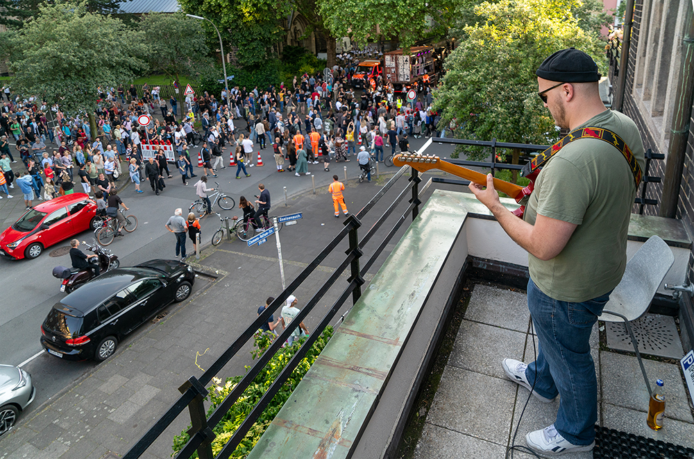 Damit das Werk funktioniert war eine Menge Koordination und Teamwork notwendig. Über Funkgeräte kommunizierten die Mitwirkenden während der Aufführung ständig. Die Verkehrswacht und weitere Ordner:innen sicherten den großen LKW. Das Tiefbauamt sperrte die Straßen für die Oper. Auf der Mallinckrodtstraße führte das zu einem Hupkonzert, welches wie ein Teil der Aufführung wirkte.