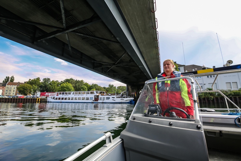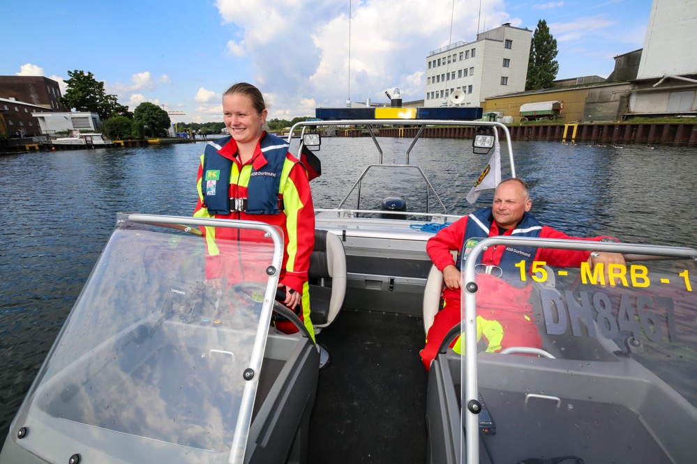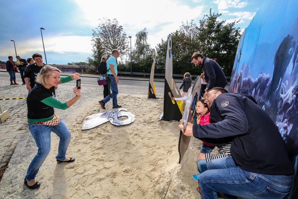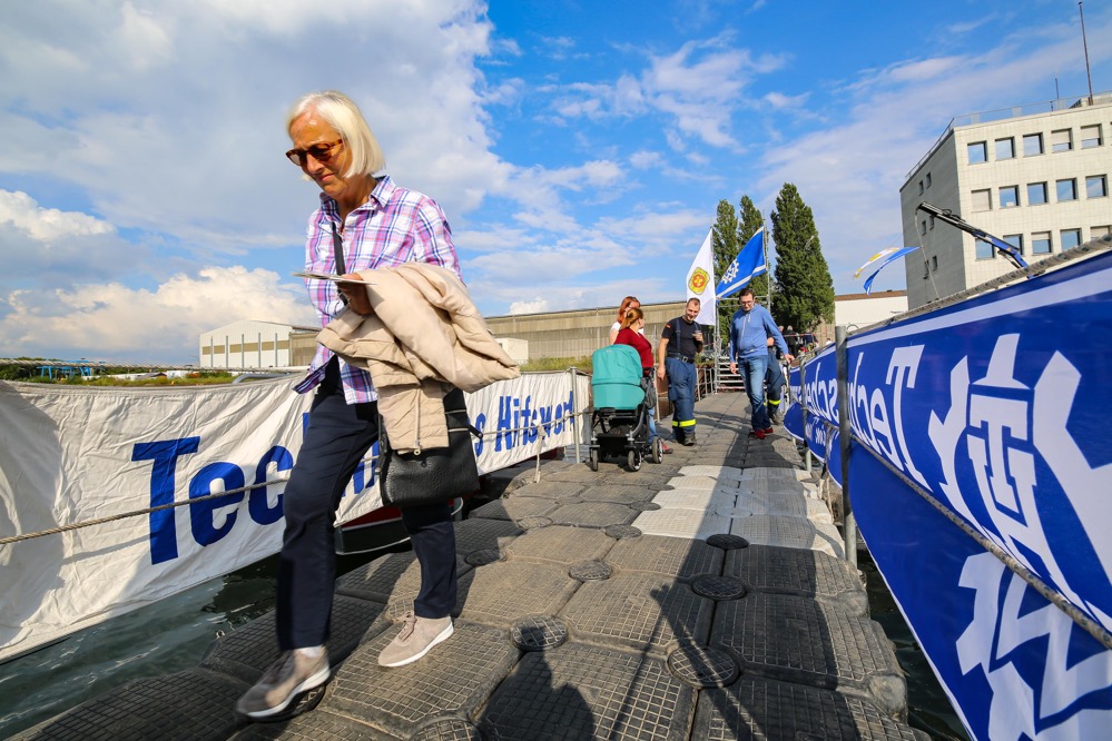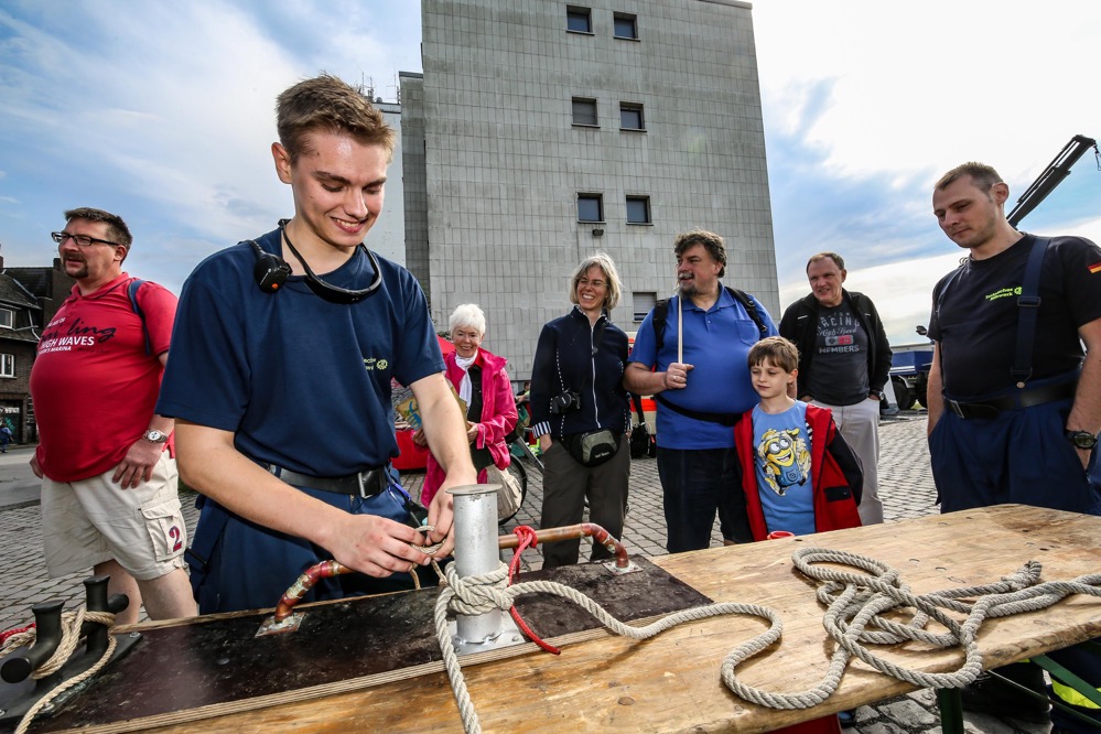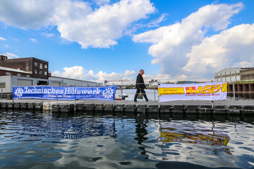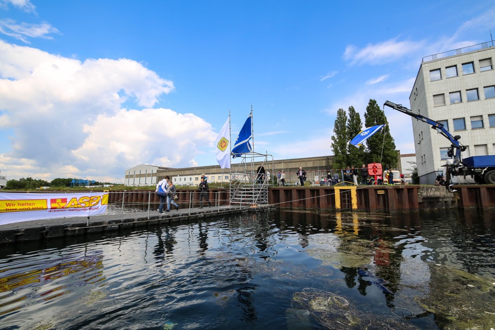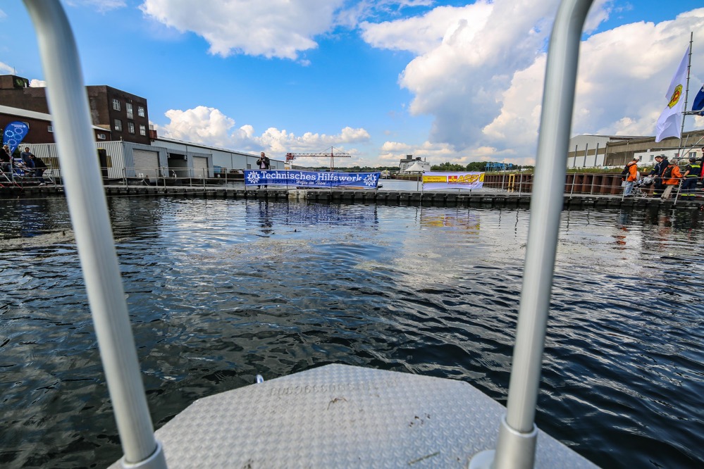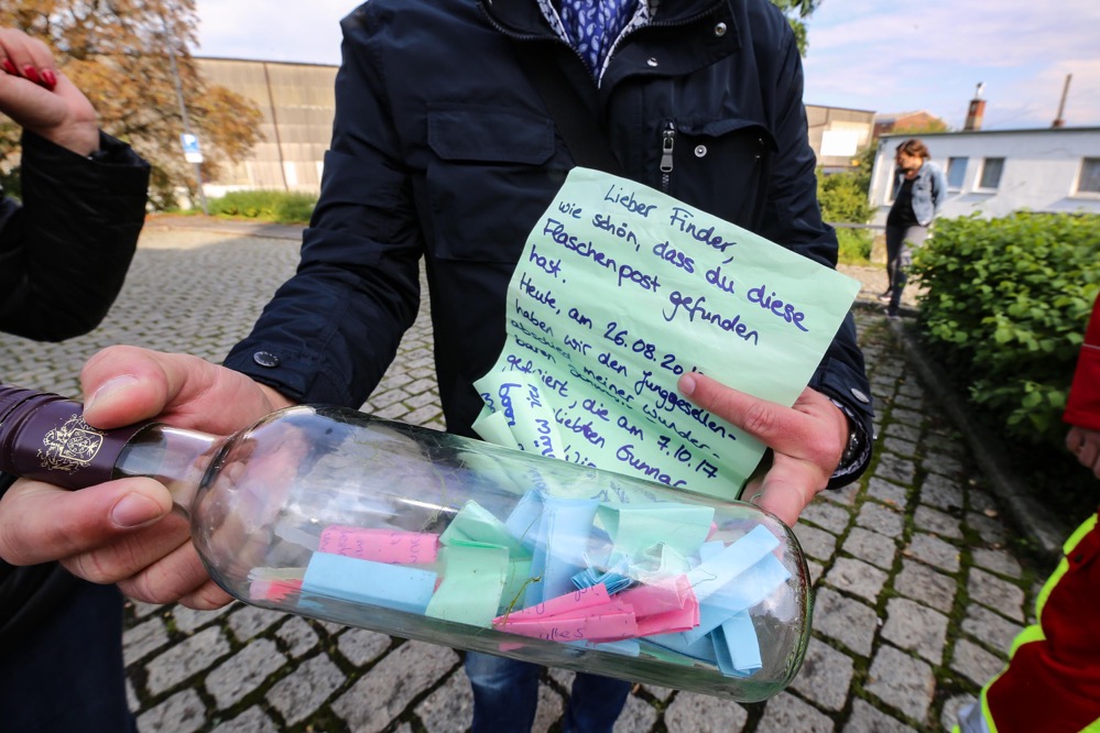 „Als Teilnehmer des Hafenspaziergangs sah ich eine Flasche durch das Hafenbecken treiben. Das darin eingedrehte Papier machte mich stutzig. War das etwa eine Flaschenpost?“, berichtet Büscher. Bei der Beantwortung dieser Frage half das anwesende Team von Technischem Hilfswerk und Arbeiter-Samariter-Bund und fischte die Flasche per Boot aus dem Wasser.