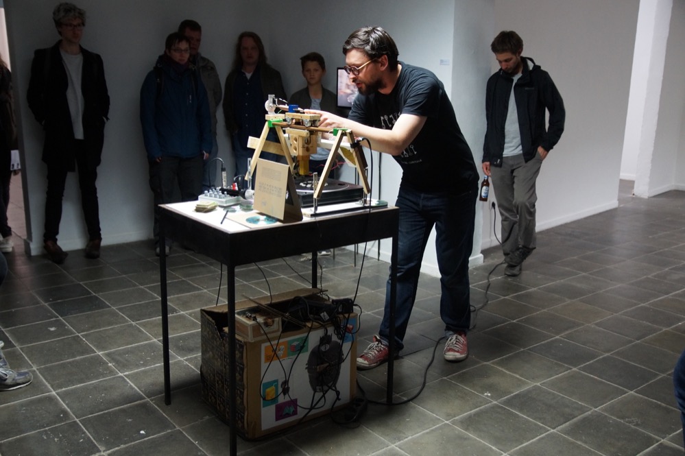 Auch Zepezauer ist Teil der Ausstellung „blind spot“. Nach der Sound-Performance stellte der Musiker sein Exponat vor: Einen selbstgemachten Phonographen, auf dem sich selbstaufgenommenes abspielen lässt. Dem Publikum erklärte er seine Arbeitsweise und forderte einen Zuschauer auf selbst ein Tonstück aufzunehmen. Anschließend demonstrierte Zepezauer wie man die fertiggestellte CD auf dem Phonographen abspielen kann.