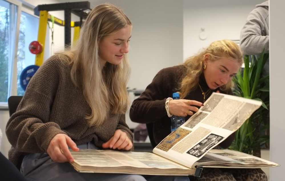 Die gesammelten Spielberichte aus den 1950er und 1960er Jahren lassen auch Torfrau Caroline Blum (l.) und die linke Verteidigerin Ann-Sophie Vogel nur staunen. Foto: Susanne Schulte für Nordstadtblogger