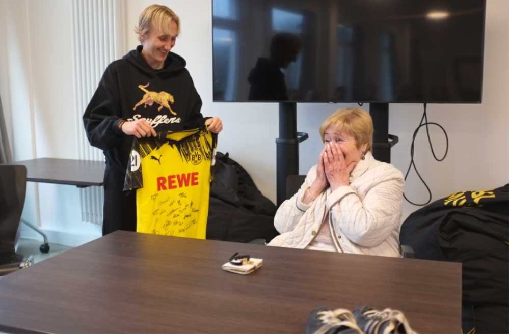 Und dann staunte Renate Breß selbst. Kapitänin Paula Reimann entfaltete ein BVB-Trikot mit den Namen aller Spielerinnen der 1. Mannschaft und dem Namen Breß auf dem Rücken. Das nahm die 88-jährige gerne mit nach Hause und wird es womöglich auch tragen, wenn sie am Nikolaustag auf der Tribüne der Roten Erde sitzt und die Frauen im Spiel gegen das Team vom FC Köln unterstützt.