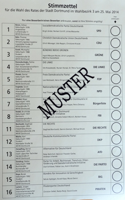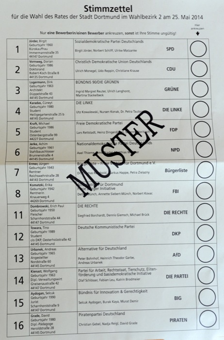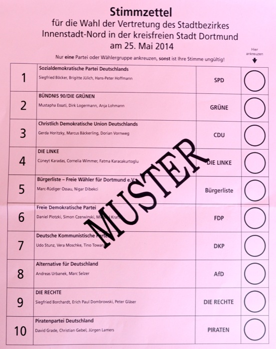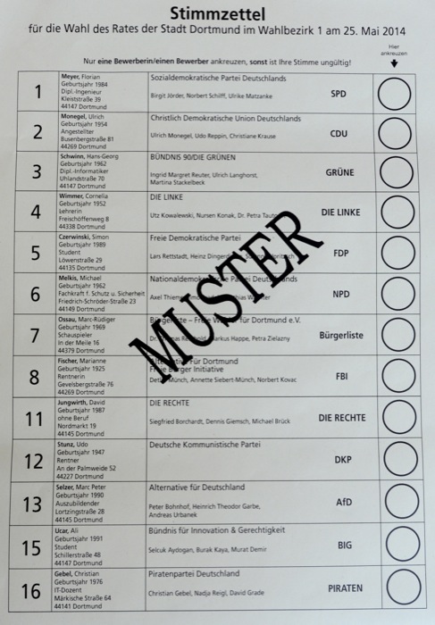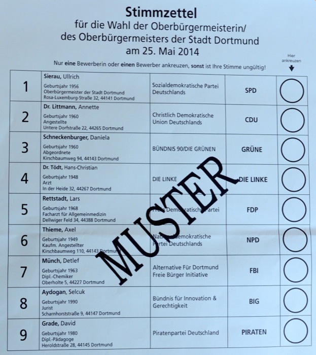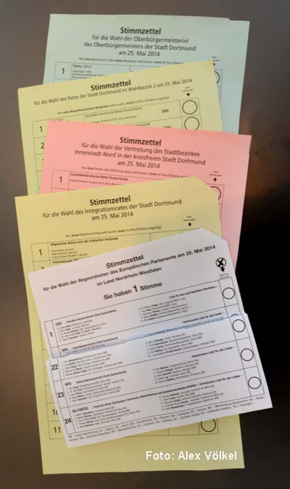Bei den Wahlen am 25. Mai 2014 gibt es in Dortmund 55 verschiedene Stimmzettel. Die Dortmunderinnen und Dortmunder erhalten je nach Wahlberechtigung jeweils einen Stimmzettel für die Europawahl, für die Wahl der Oberbürgermeisterin/des Oberbürgermeisters, für die Wahl des Rates, für die Wahl der Bezirksvertretung und für die Wahl des Integrationsrates. Eine Person kann also bis zu 5 Stimmen bei den Wahlen abgeben.