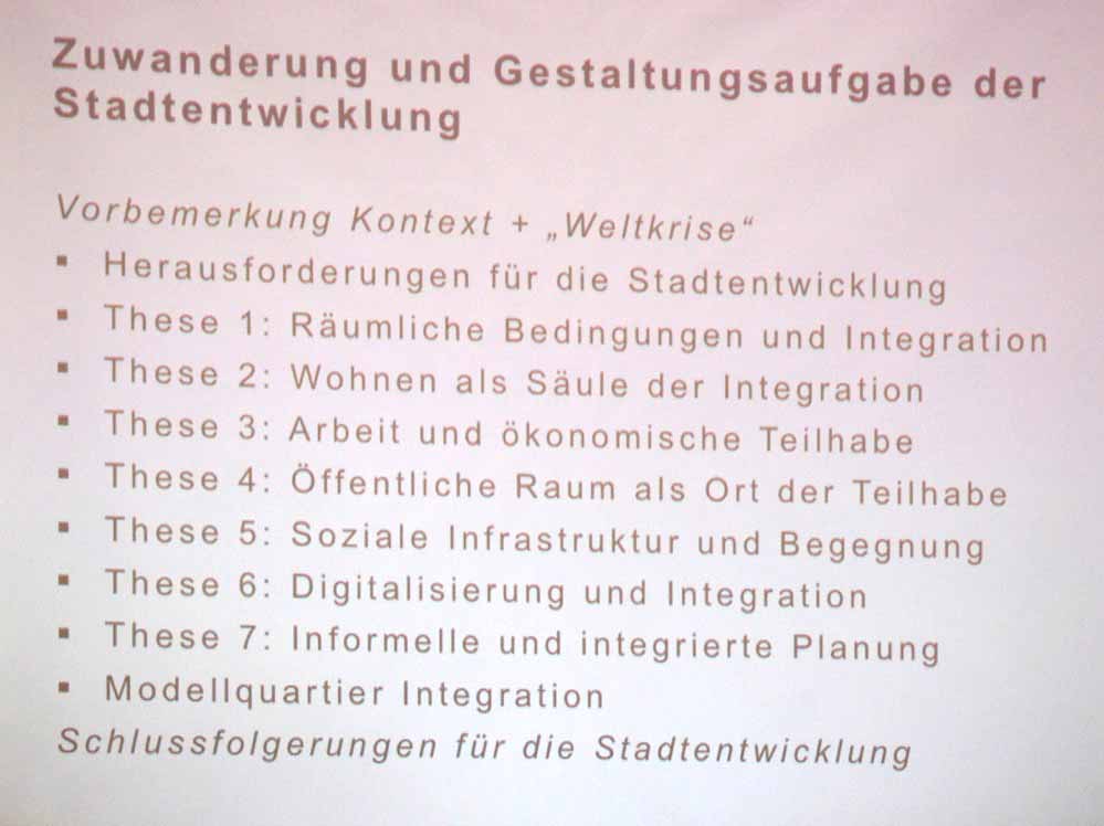 Das Gute: Deutschland als Einwanderungsland hat viel Erfahrung mit Zuwanderung. Nun gelte es, die früheren Fehler nicht zu wiederholen. Was kommt nach Turnhallen, Zelten und Kasernen? Das Ziel der Stadtentwicklung: „Eine gerechte, inklusive,,aber auch sichere Stadt für uns alle“.