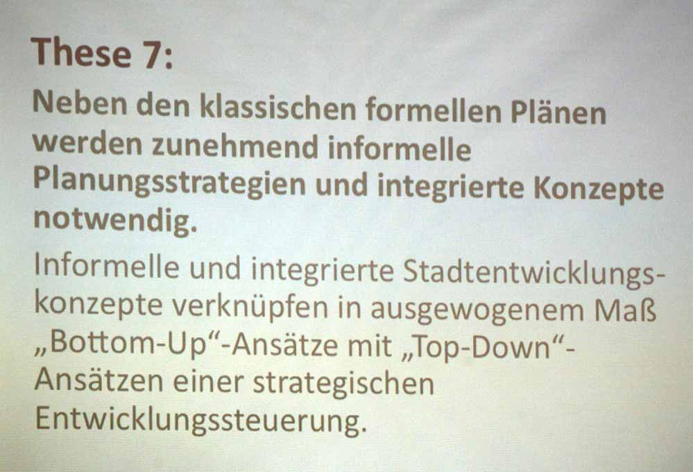 • These 7: Neben den klassischen formellen Plänen werden zunehmend informelle Planungsstrategien und integrierte Konzepte notwendig. (mehr dazu in den Folien in der Fotostrecke)