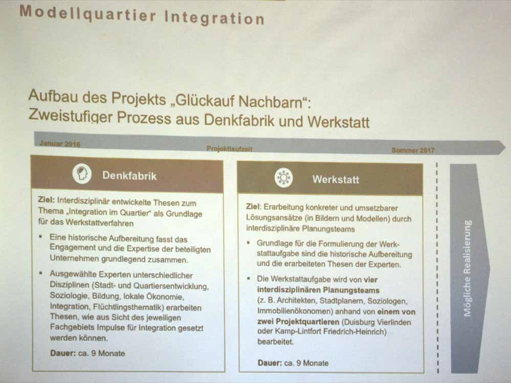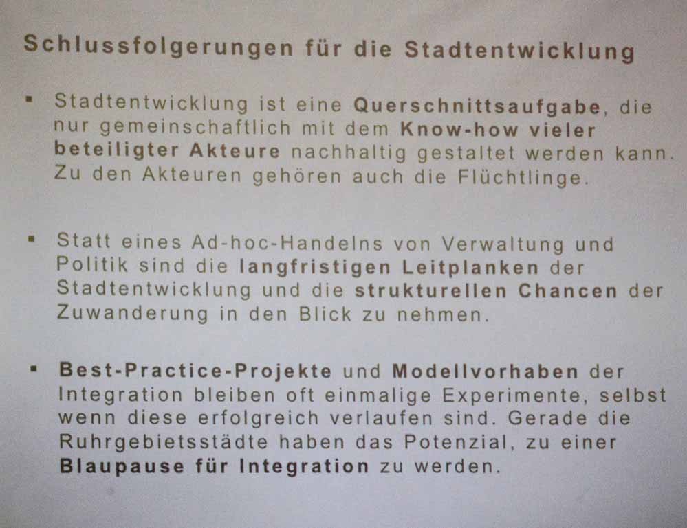 Außerdem warnte sie – wie auch viele Akteure vor Ort – vor einer „Projektitis“: „Viele Best-Practice-Projekte und Modellvorhaben der Integration bleiben oft einmalige Experimente, selbst wenn diese erfolgreich verlaufen sind. Gerade die Ruhrgebietsstädte haben das Potential, zu einer Blaupause für Integration zu werden“, so Stadtplanerin.