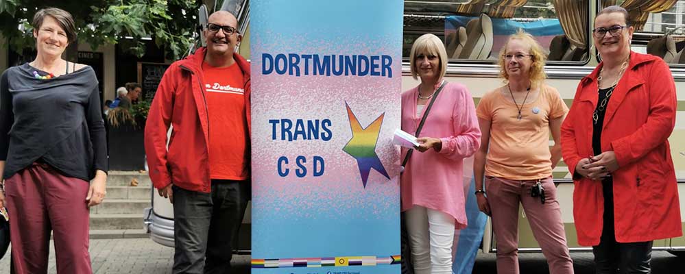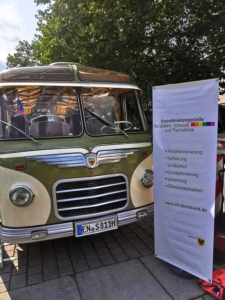Der „TRANS*CSD on tour“ war der Ersatz für die coronabedingt ausgefallene große Infomeile mit mehr als 20 Ständen. „Die Idee mit dem Oldtimerbus hat sich bewährt. Es sind Passant*innen auf uns zugekommen und mit uns ins Gespräch gekommen, die sonst an Ständen vorbeigegangen wären“, so Natascha Zimmermann, die Initiatorin des Dortmunder TRANS*CSD.