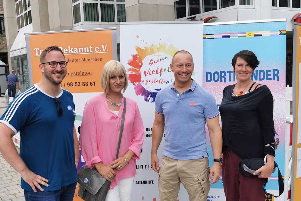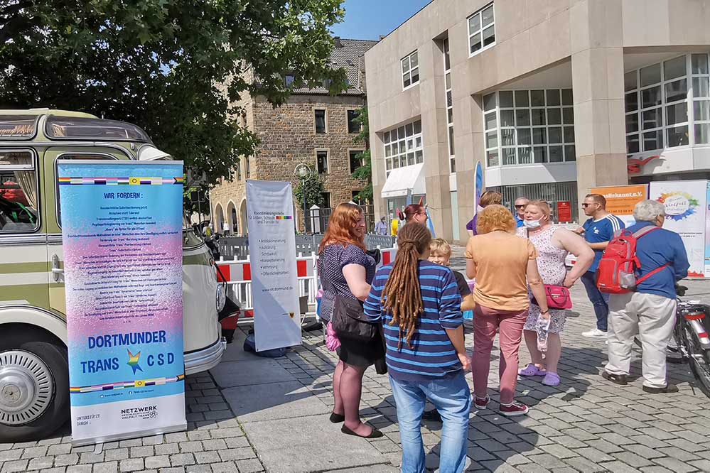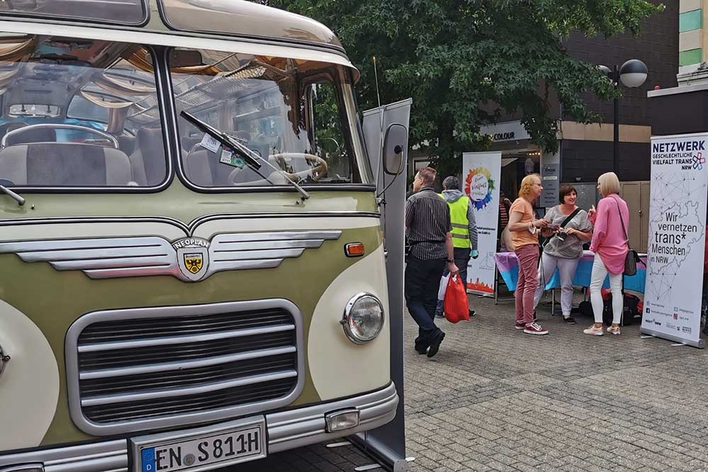 Mit dem Hombrucher Markt, dem Markt am Hansaplatz, der Petrikirche und der Kleppingstraße wurden gleich mehrere belebte Marktplätze und Einkaufsstraßen mit dem auffälligen Oldtimerbus angefahren. Jeweils 1,5 Stunden informierte der TRANS*CSD mit schnell aufgebauten Informationsmaterialien im Sinne eines Pop-Up-Standes die Passant*innen.
