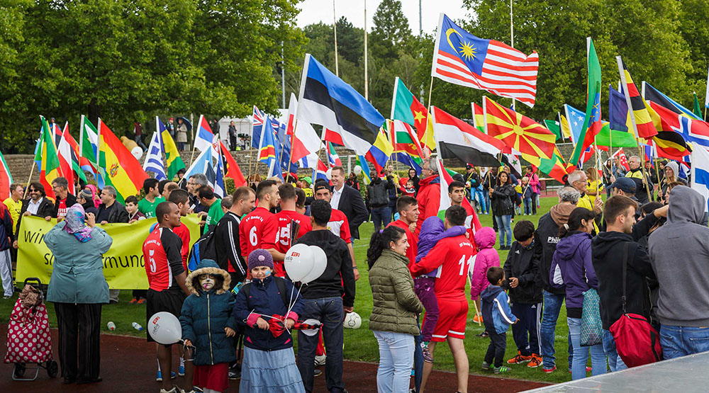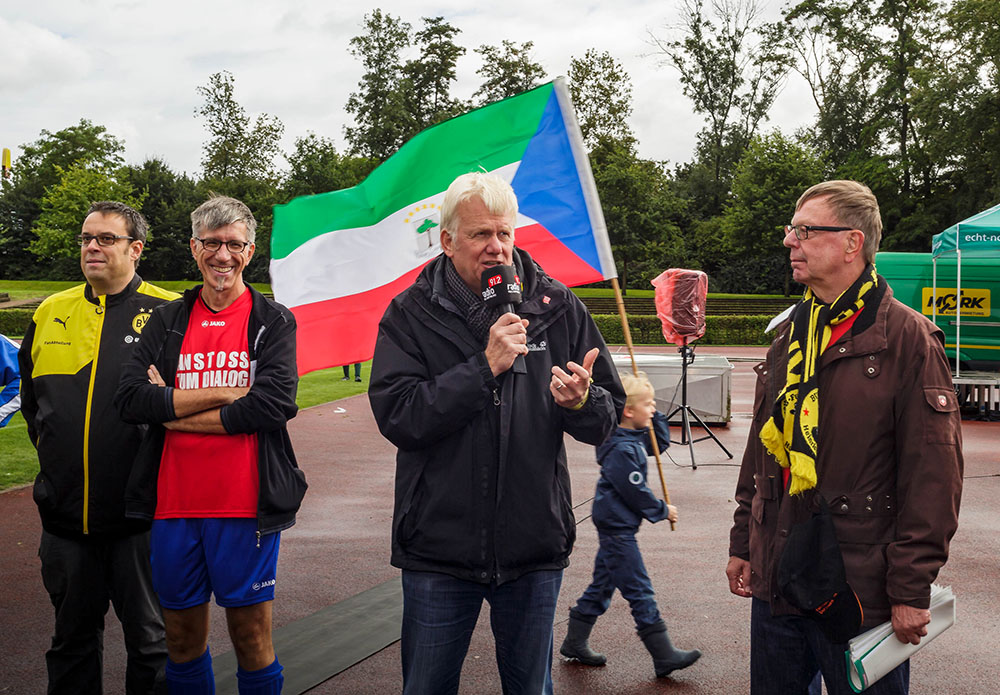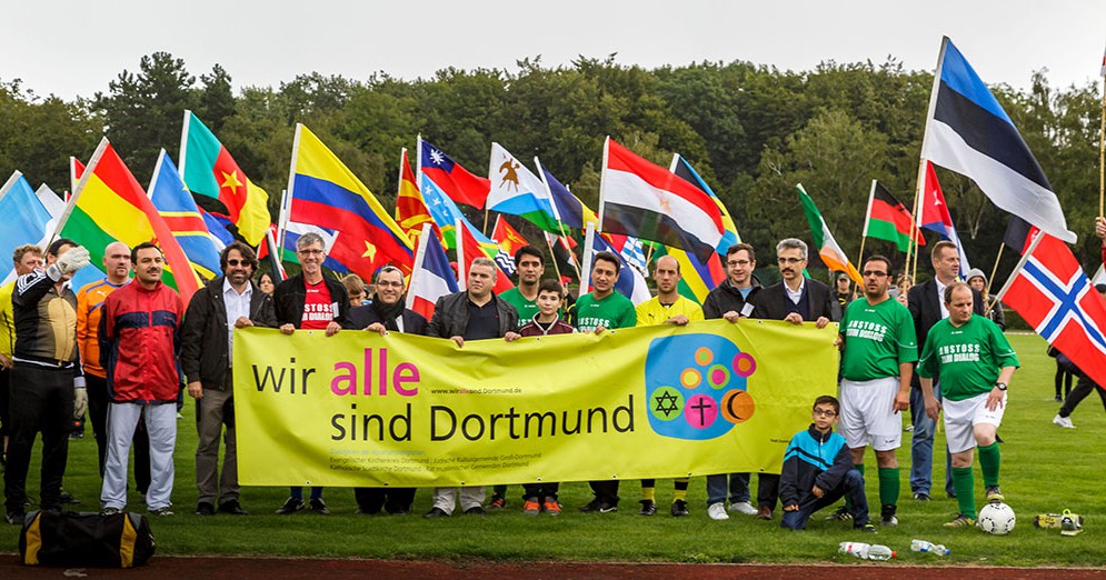Zum Jubiläum gab es noch etwas Besonderes: Das Fußballturnier der Religionen unterstützte die Kampagne „Wir alle sind Dortmund“, deren Logo auch auf dem Großplakat prangt, mit einem „Fahnenlauf der Nationen“.