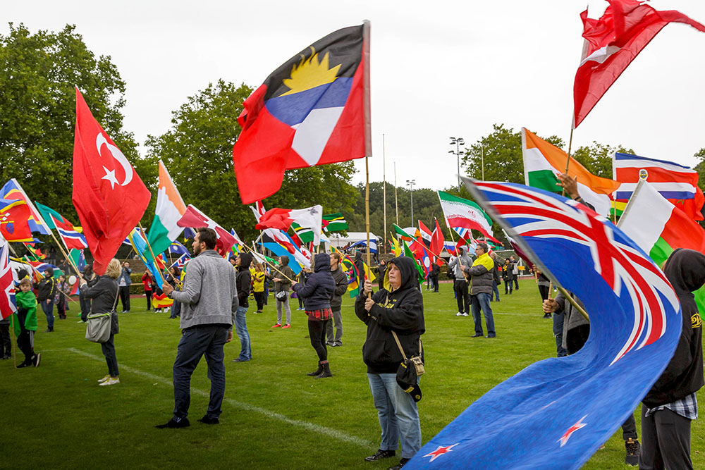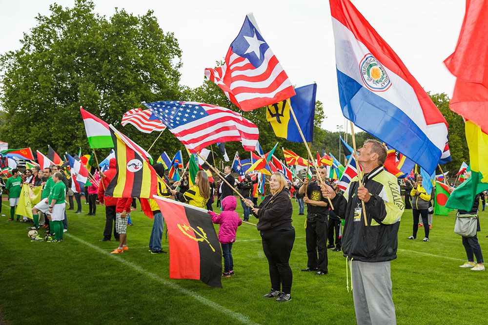 Menschen aus 189 Nationen leben in Dortmund. Die Fahnen all dieser Nationen wurden aufs Fußballfeld getragen. Flüchtlinge aus verschiedenen Ländern und die BVB-Fanabteilung unterstützten die Veranstalter dabei.