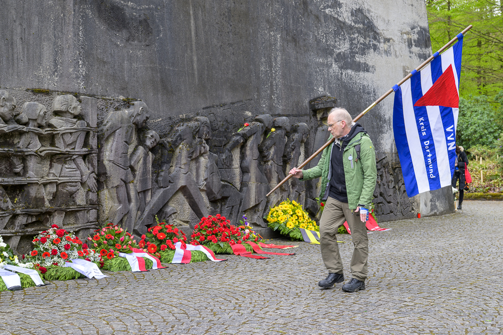 Einen aktuellen Bezug zur Politik stellte Georg Deventer her, Vorsitzender des Fördervereins der Mahn- und Gedenkstätte Steinwache / Internationales Rombergpark-Komitee e.V. So betonte Deventer, dass auch wenn mit dem Ende des Krieges eine vollständige Entnazifizierung in der Bundesrepublik nicht stattgefunden habe, der Leitgedanke „Nie wieder Krieg, nie wieder Faschismus“ bis ins neue Jahrtausend hinein in der öffentlichen Debatte eine zentrale Rolle gespielt habe.