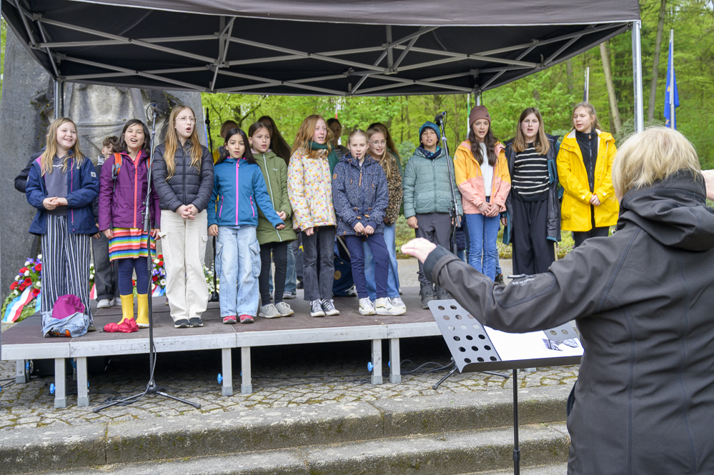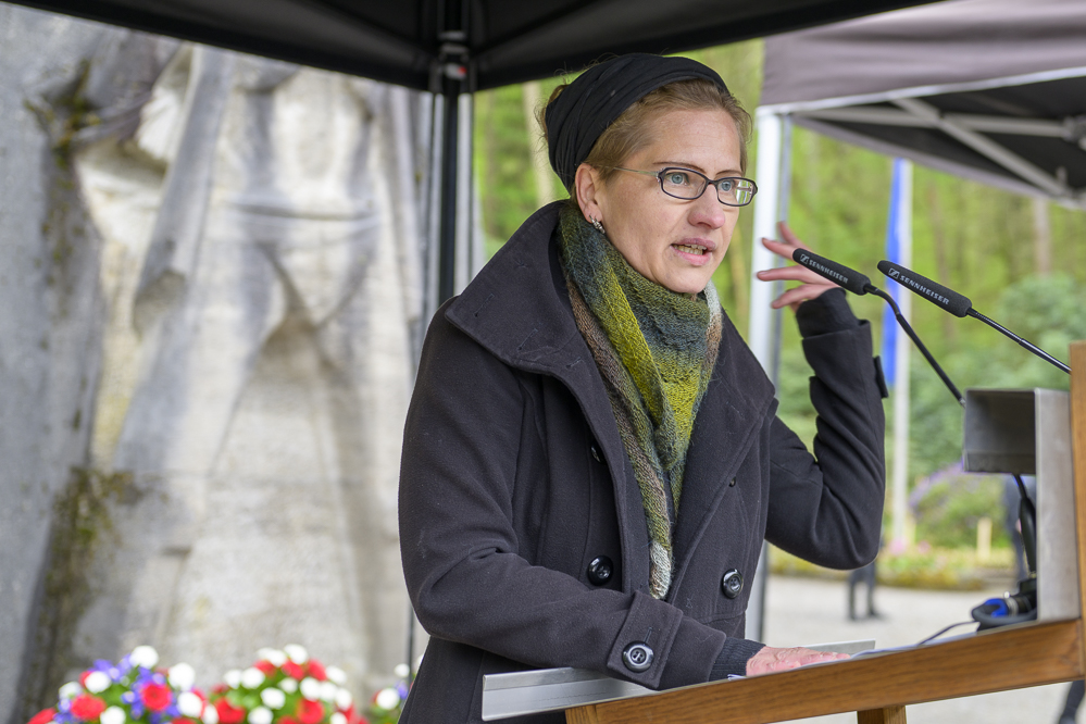Sie betonte, dass das Gedenken nicht mit dem Krieg endete, sondern bis heute fortwährend und beständig sei. „Europa und die Alliierten hatten die braune Pest endlich zurückgeschlagen“, erzählte sie aus der Perspektive der befreiten Zwangsarbeiter, die 1945 nach Hause zurückkehrten.