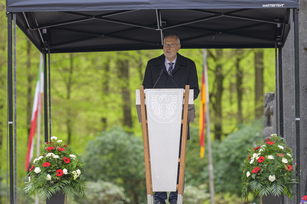 In der Bittermark angekommen, eröffnete um 15 Uhr Friedhelm Evermann, Sonderbeauftragter des Oberbürgermeisters für Vielfalt, Toleranz und Demokratie, die Gedenkveranstaltung. Er begann seine Rede mit den Worten, dass das gemeinsame Gedenken der Opfer der Gestapo und des Krieges seit 80 Jahren in Dortmund stattfinde.