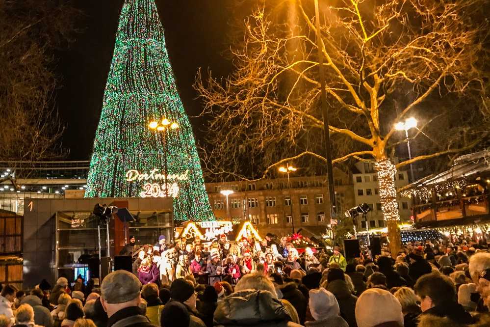Am Tag vor Heiligabend versammeln sich wieder zahlreiche Dortmunder:innen auf dem Hansaplatz um sich musikalisch auf den großen Festtag einzustimmen. Im Lichterglanz des Weihnachtsbaums kommen hunderte Menschen zusammen, um diese Tradition zu feiern.