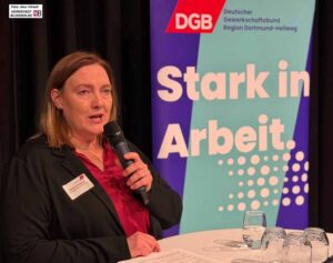 Eingeleitet wird der Abend von Bärbel Sumagang, Geschäftsführerin der DGB-Region Dortmund-Hellweg. Zu Beginn ihrer Rede macht sie deutlich, dass die Gewerkschaften in die anstehenden politischen Entscheidungen eingebunden werden wollen. „Wollen wir nur reagieren oder wollen wir gestalten?“, fragt sie die Versammelten. Gegenüber Politik und Wirtschaft wolle man selbstbewusst auftreten, um die Interessen der arbeitenden Bevölkerung wirksam zu vertreten.