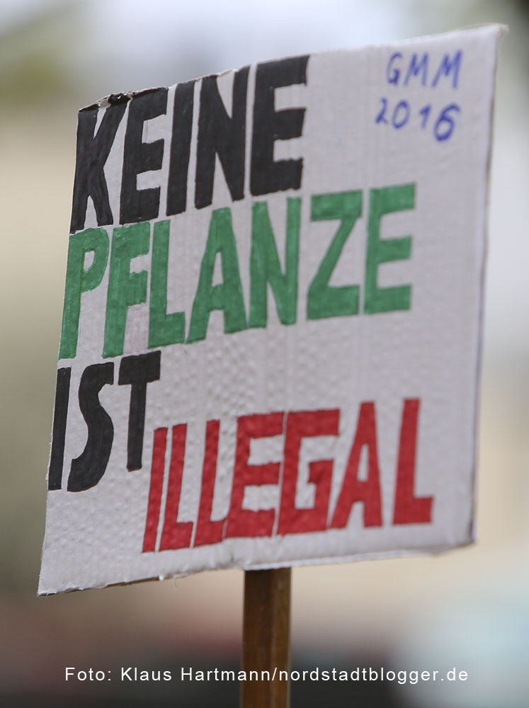 „Blühe im Glanze dieses Glückes“ stand in Anlehnung an die Deutsche Nationalhymne – verziert mit einem Hanfblatt, auf einem Pappschild.
