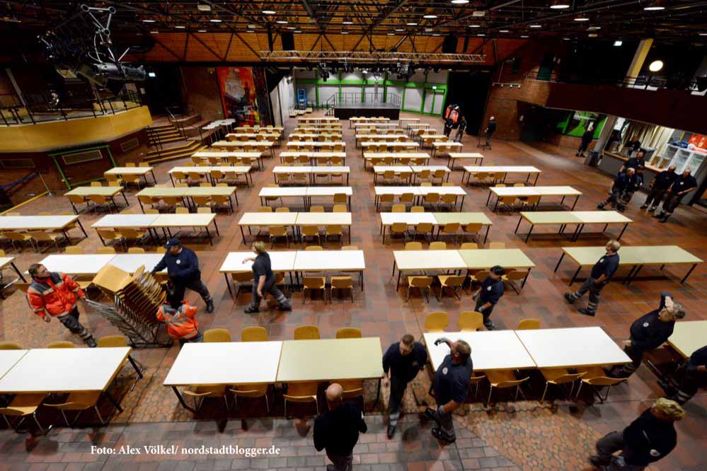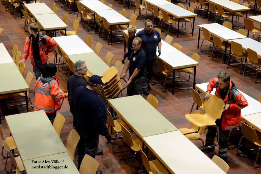Daher werden die zahlreichen Mitarbeiterinnen und Mitarbeiter der Hilfsdienste sich wohl den ganzen Sonntag um die Flüchtlinge im Dietrich-Keuning-Haus kümmern, bis diese landesweit mit Bussen auf Einrichtungen verteilt werden.