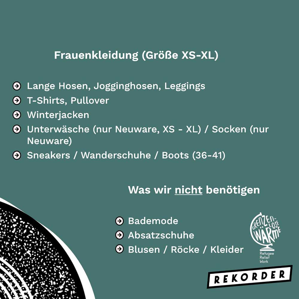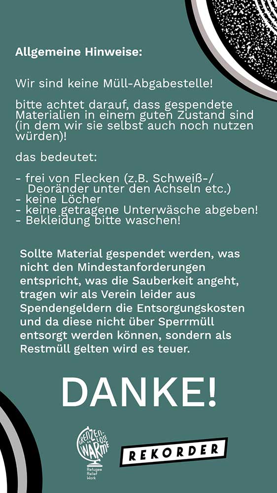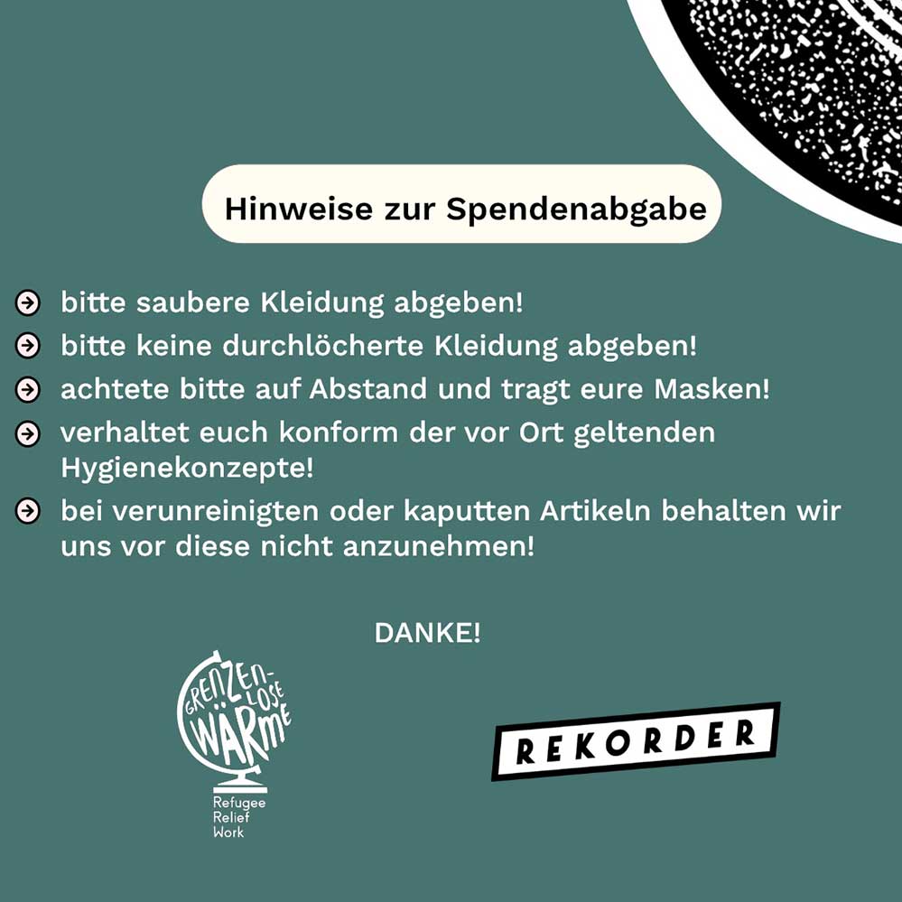 Der Verein „Grenzenlose Wärme“ (Grenzenlose Wärme Refugee Relief Work e.V.) organisiert an regelmäßigen Terminen im Dortmunder Rekorder, Gneisenaustraße 55, Spendenaktionen für hilfsbedürftige Menschen. Gesammelt werden Sachspenden wie Bekleidung, Hygieneartikel, Zelte, Schlafsäcke, Isomatten, Smartphones, Rucksäcke oder Wolldecken. Die Spenden sollten sich in einem guten Zustand befinden.