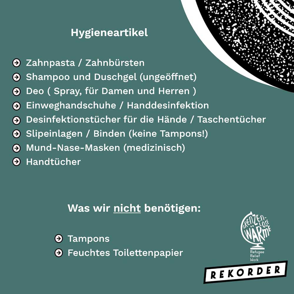 Im Rekorder werden die Spenden gesammelt und verpackt. Mehrmals jährlich werden dann Fahrten mit Hilfsgütern zu Camps, überwiegend an den europäischen Außengrenzen, vom Verein durchgeführt, verbunden mit einem Einsatz vor Ort. Mehr Infos unter: www. grenzenlose-waerme.blog