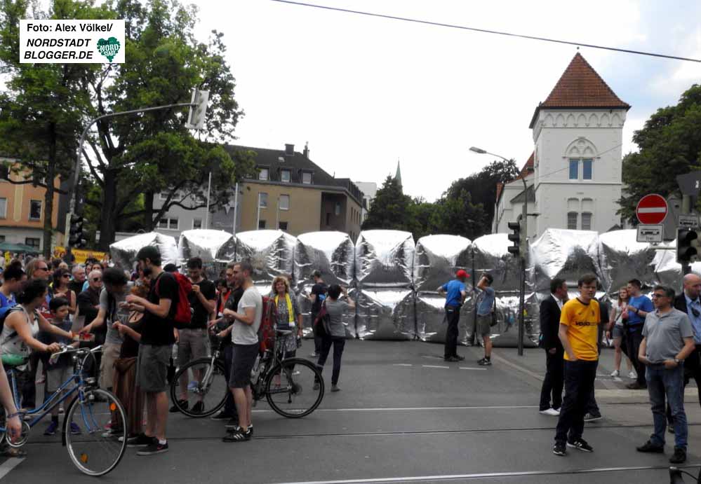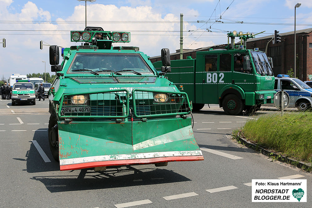 Mussten sich nicht die gegen den Nazi-Aufmarsch Protestierenden zum Beispiel auf dem Huckarder Marktplatz angesichts fast aller abgesperrten Ausgangsmöglichkeiten praktisch eingekesselt fühlen? Dass die zum Platz ausgerichteten Rohre zweier Wasserwerfer nicht zur Deeskalation dienten, ist wohl auch nicht von der Hand zu weisen.