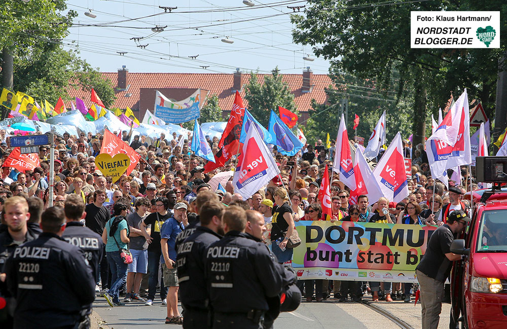 Rund 3000 Menschen nahmen am Demonstrationszug des Arbeitskreises gegen Rechtsextremismus vom Dortmunder U zum Wilhelmplatz in Dorstfeld teil. In Hör-, Sicht- und Rufweite konnten sie den Neonazis an ihrem Aufmarschort „ihre Meinung sagen“.