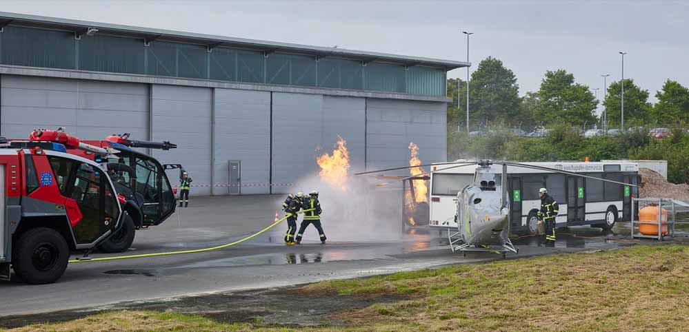 Um dies zu trainieren, wurde simuliert, dass zwei Luftfahrzeuge auf dem Rollfeld kollidieren. Dabei geriet ein Triebwerk in Brand, in beiden Luftfahrzeugen gab es eine starke Rauchentwicklung. „Die Brandbekämpfung hat gut funktioniert“, freut sich Dietmar Stange, Leiter der Flughafen-Feuerwehr, über den Ausgang der Übung.