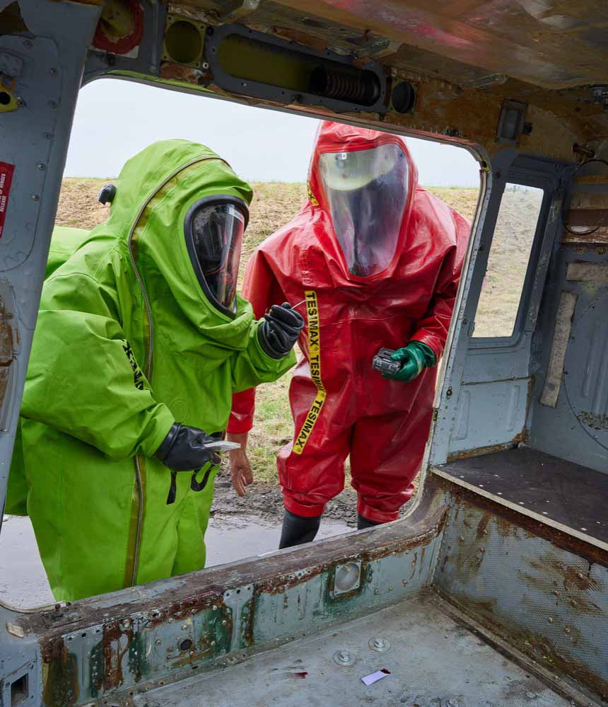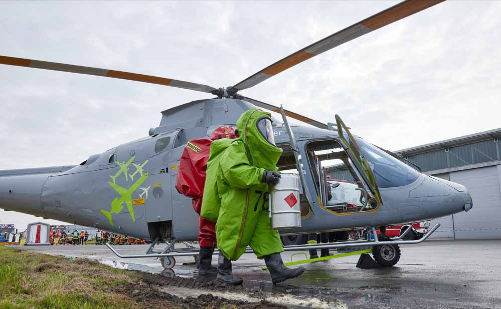 Ein weiteres Übungsziel war das Training im Umgang mit Gefahrstoffen, ‚Dangerous Goods‘, wie sie am Flughafen genannt werden. „Wir haben simuliert, dass eines der Flugzeuge auch Fracht geladen hat. Dadurch ist für die Einsatzkräfte eine ABC-Lage entstanden“, so Stange. Wichtig bei diesen Einsatzsituationen ist die interne Kommunikation. Durch realitätsnahe Szenarien wird die Kommunikation zwischen allen Instanzen trainiert und aufgefrischt.