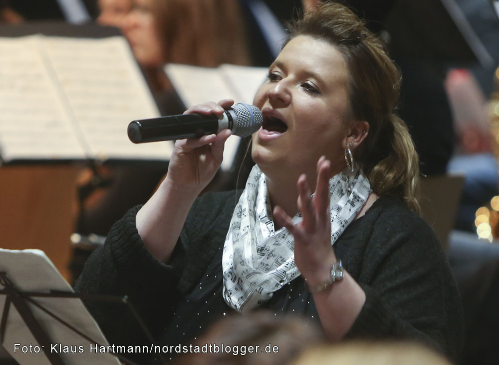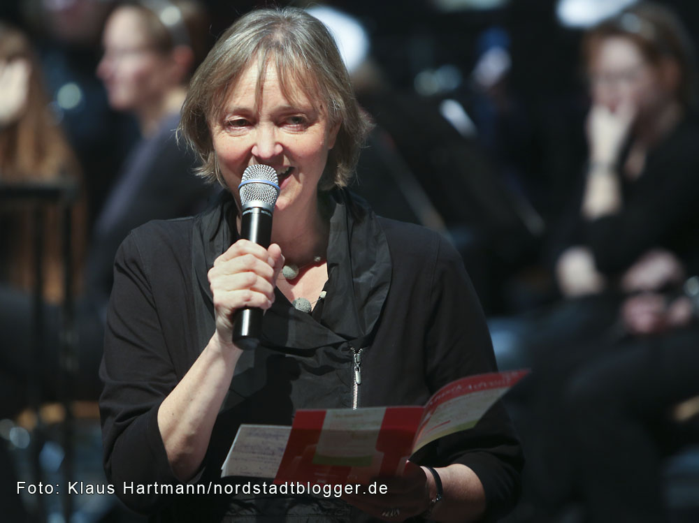 Sie wusste zu jedem Chor – neben den Kindern traten auch der Elternchor des Helmholtz-Gymnasiums auf und der Singkreis des Dietrich-Keuning-Hauses – kleine Geschichten zu erzählen, berichtete vom musikalischen Interesse des Nachwuchses im Akkordeonorchester und sorgte für die verbindenden Worte zwischen den Weihnachtsliedern des großen Finales, dem Liederzyklus „Die Winterrose“.