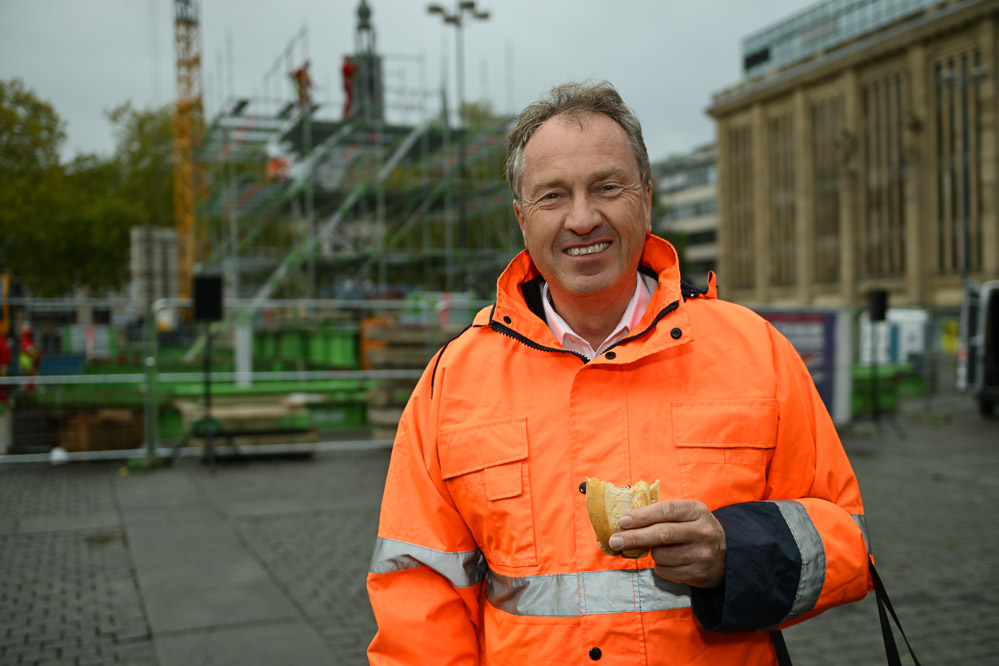 Carsten Weise, Inhaber der Gerüstbaufirma, gönnt sich während der Arbeiten eine erste Bratwurst. „Wir ändern die Dekoration etwas“, erzählt er. „Über die Jahre haben wir einen großen Fundus an Baumschmuck gesammelt. Viele fanden den Baum im letzten Jahr etwas karg – das nehmen wir ernst. Dieses Jahr schmücken wir wieder üppiger.“ Zwischen Metall, dem Geruch nach Bratwurst und Glühweinaroma liegt Zuversicht in der Luft.