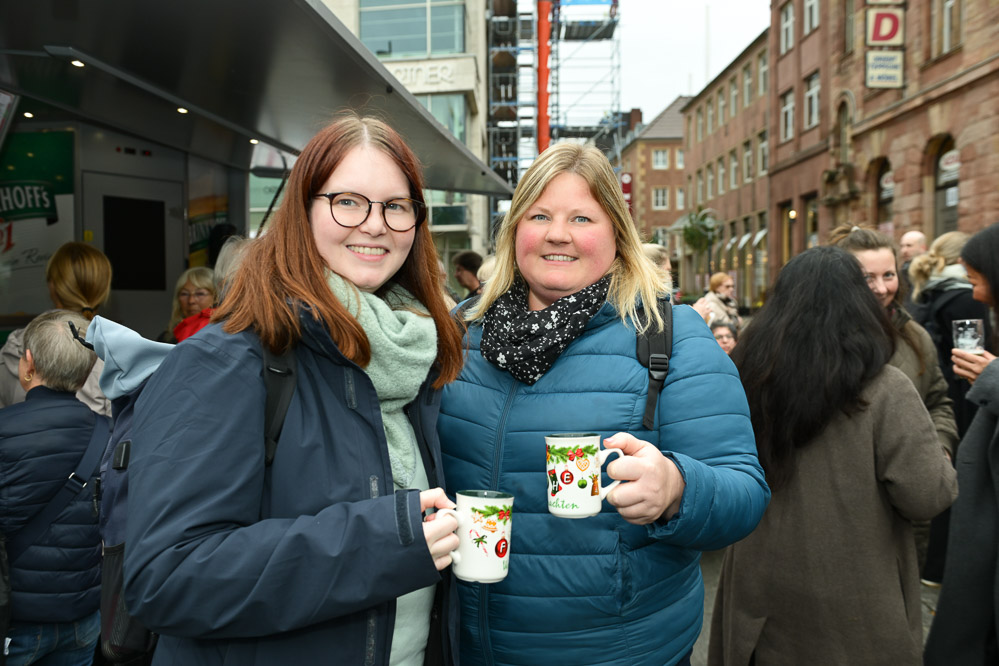 Ein Anstoßen, ein Lächeln, Dampf, der aus den Glühweintassen steigt. Carolin Dornbusch und Jenifer Pioscyk genießen den Moment – wie viele andere, die an diesem Nachmittag die Vorfreude auf die Weihnachtsstadt teilen.