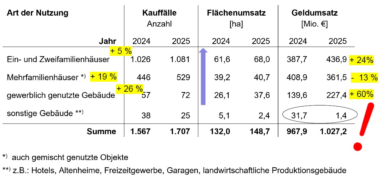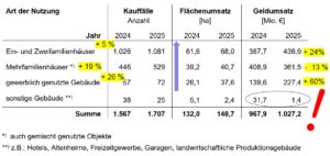 Besonders gefragt bleiben Ein- und Zweifamilienhäuser: Hier stiegen die Verkaufszahlen um fünf Prozent, der Umsatz legte sogar um 24 Prozent zu. Mehrfamilienhäuser wurden zwar häufiger verkauft (+19 Prozent), erzielten insgesamt jedoch einen geringeren Umsatz, was auf starke Schwankungen bei einzelnen Objekten zurückgeführt wird.