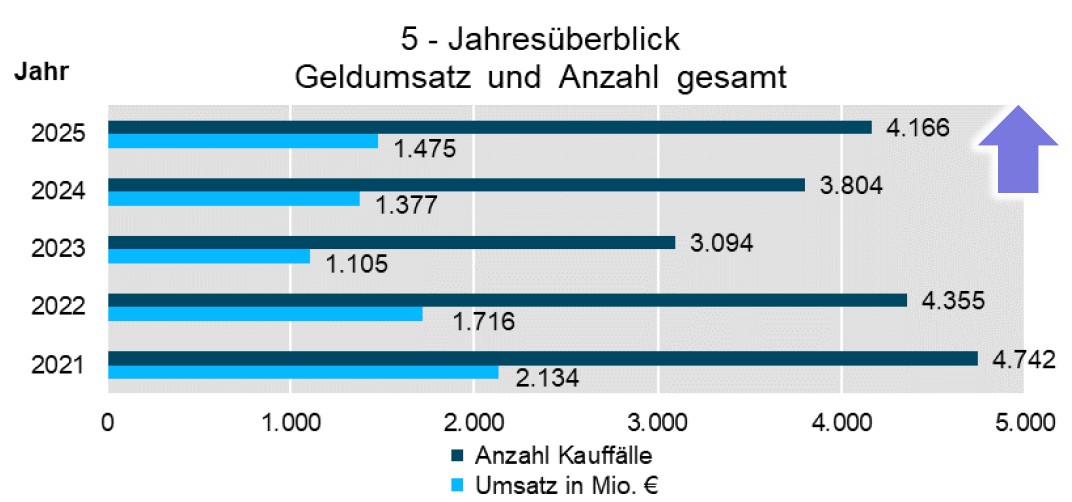 Auch der Geldumsatz ist gestiegen und liegt nun bei fast 1,5 Milliarden Euro. Damit bleibt der Markt jedoch weiterhin deutlich hinter den Spitzenwerten der Niedrigzinsphase zurück: 2021 wurden noch rund 4.700 Immobilien für insgesamt etwa 2,1 Milliarden Euro verkauft.