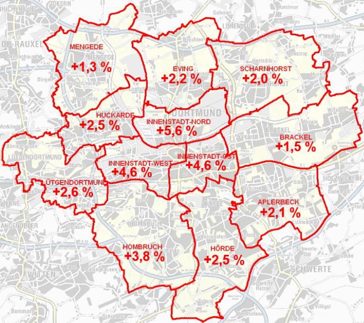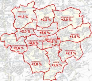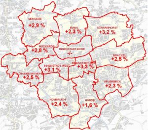 „Die Unterschiede zwischen den Stadtteilen zeigen deutlich, wie stark Lage und Umfeld den Immobilienpreis beeinflussen“, betont Meyer-Dietrich. So fallen die Preissteigerungen in Huckarde, Eving und Scharnhorst überdurchschnittlich aus, während sie in innenstadtnahen oder bereits hochpreisigen Lagen geringer ausfallen.