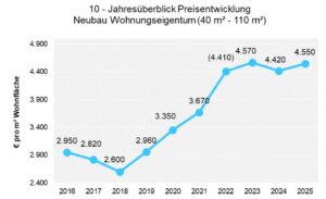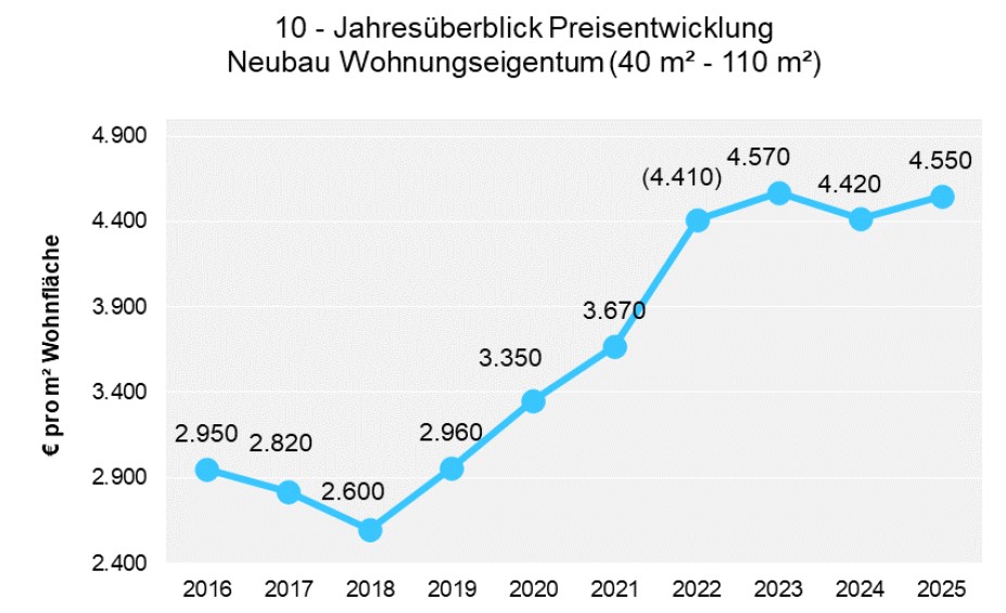 Für neu gebaute Eigentumswohnungen zahlen Käuferinnen und Käufer derzeit im Schnitt rund 4.550 Euro pro Quadratmeter Wohnfläche und damit etwas mehr als in den beiden Vorjahren.