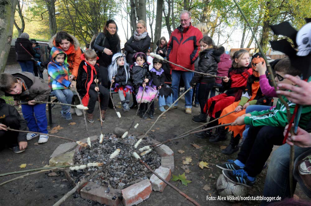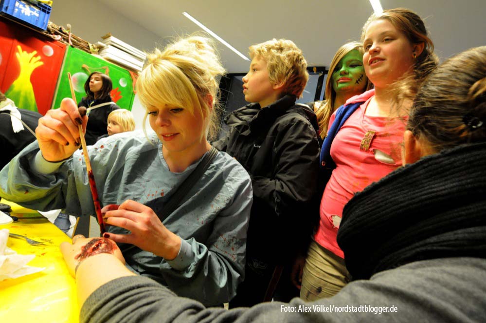 Wer noch nicht ausreichend präpariert war, konnte sich in der Schmink- und Kostümwerkstatt und im Wundenlabor noch gruselig ausstatten lassen. Bei Stockbrot an der Feuerstelle, selbstgekochter Kürbissuppe aus der Hexenküche und Waffeln aus dem Gruselcafé konnten sich alle Gäste stärken.