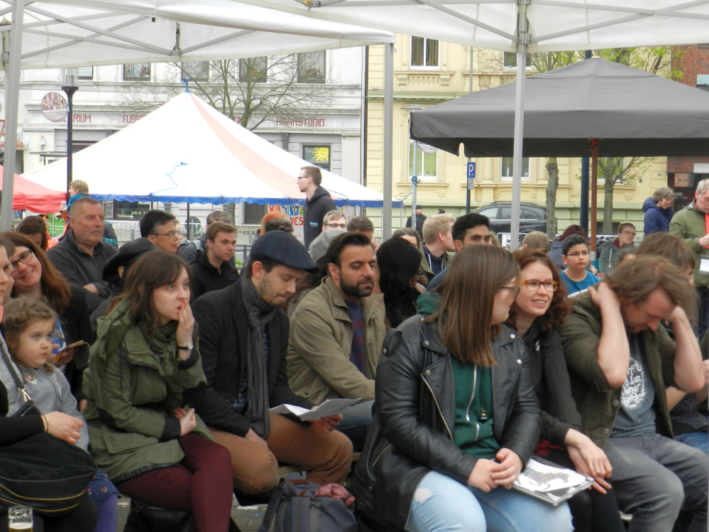 Abschluss des Tages war der Auftritt der bekanntesten Poetry-Slammer von NRW. Jay Nightwind präsentierte in der Szene bekannte Namen wie Tobi Katze, Jan Bühlbecker, Zwergriese, Fatima Talalini, Svenja Przigoda, Moustafa Siala, Tobias Beitzel und Felicitas Friederich. Ihre engagierten und provozierenden Texte kamen bei einem nicht nur jugendlichen Publikum sehr gut an und brachten auch manchem interessierten Dorstfelder diese Kunstform nahe.