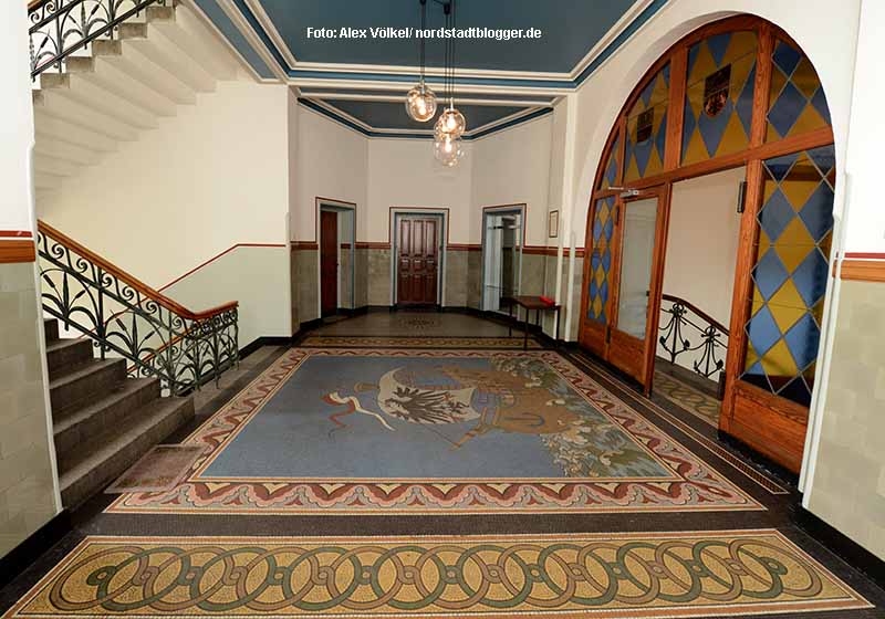 Der Mosaikboden im Erdgeschoss zeigt eine Hansekogge mit einem Segel, auf dem ein Adler, das Dortmunder Wappentier, den Widrigkeiten der Zeiten trotzt. Über dem Haupteingang prangen die Stadtwappen von Dortmund und Emden, die von Delphinen getragen werden, den Zugtieren Poseidons.